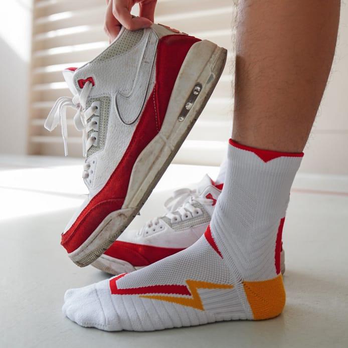 Носки Ehot Mamba White Quarter Socks средней длины белого цвета с лаконичными красными и желтыми полосками созданы в честь игрока Коби Брайанта и его прозвища Black Mamba. Компрессионные рельефные вставки создают дополнительную поддержку лодыжки. Они отлично подходят для тренировок и частой носки, так как легко пропускают воздух и впитывают влагу.