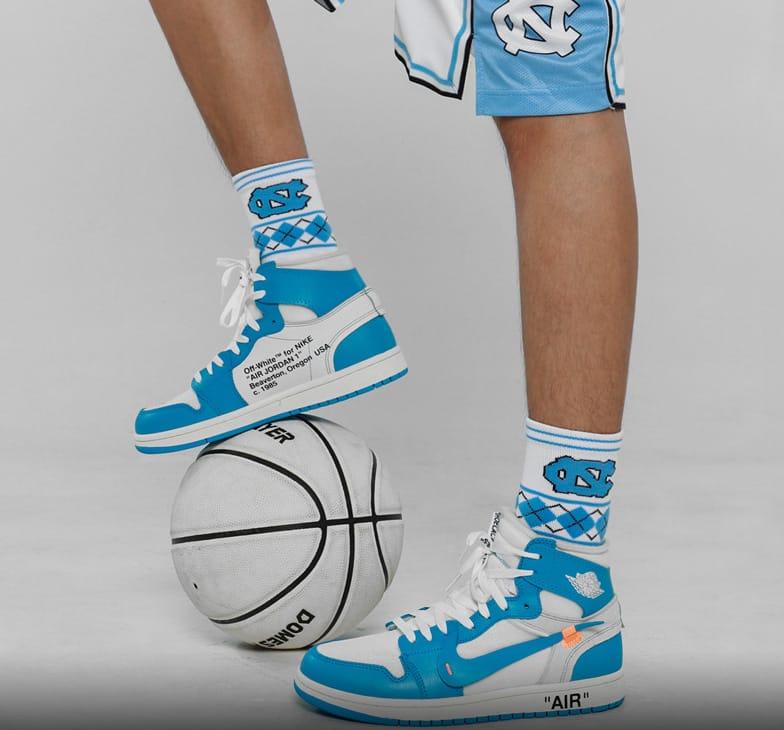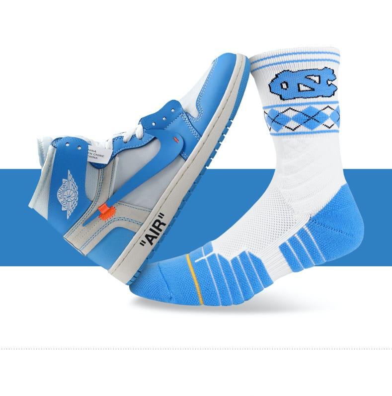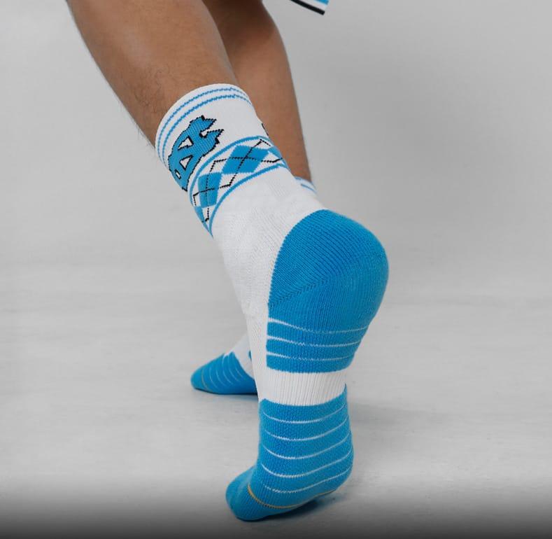 Носки Ehot North Carolina Logo Crew Socks белого цвета с голубыми элементами понравятся любителю баскетбола, так как выполнены в цветах клуба North Carolina University и дополнены символикой команды. Носок с сетчатыми вставками имеет особое компрессионное плетение, так что они обеспечивают поддержку голеностопа в определенных местах.