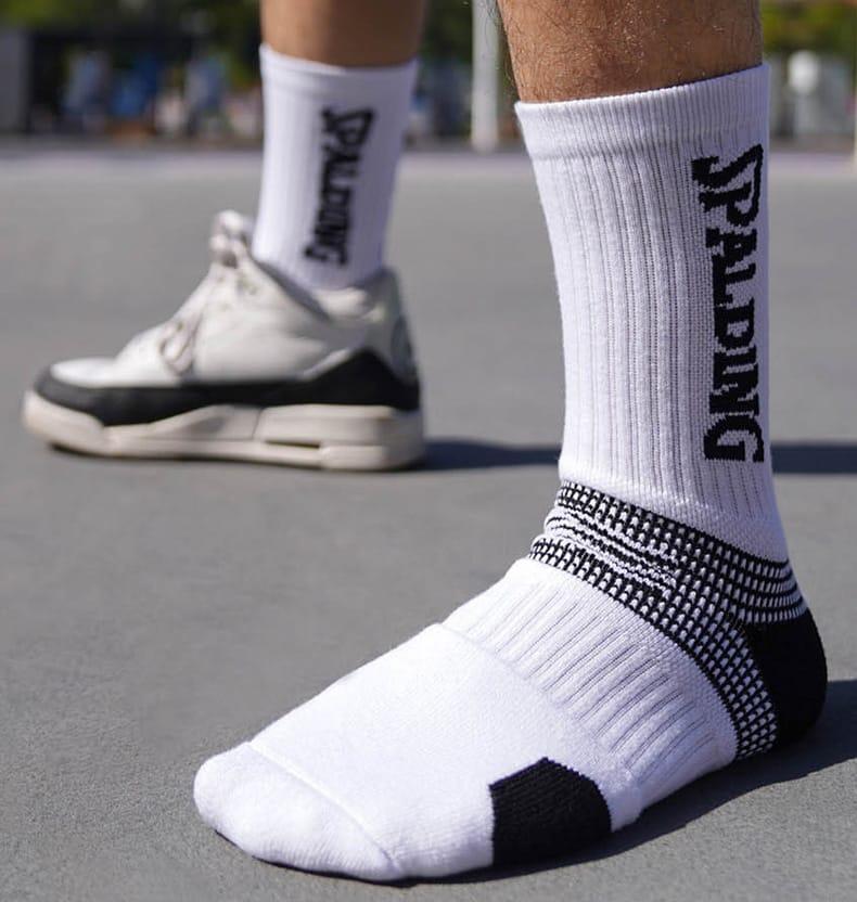 Носки Ehot Spalding Wave White Crew Socks высокие белого цвета с черной надписью Spalding по бокам плотно обхватывают ногу. Контрастные компрессионные вставки в районе щиколотки и взъема создают поддержку стоп и защищают от вывихов. Спортивные носки с уплотненной подошвой эффективно амортизируют при движении и свободно пропускают воздух.