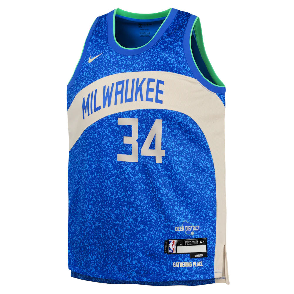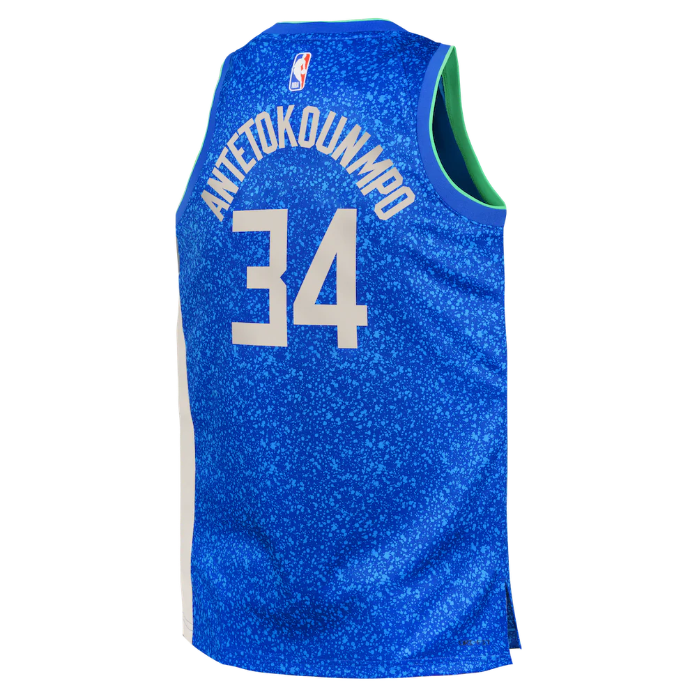 - Баскетбольная джерси 2023-24 Milwaukee Bucks Giannis Antetokounmpo #34 Youth Swingman City Edition Blue Jersey