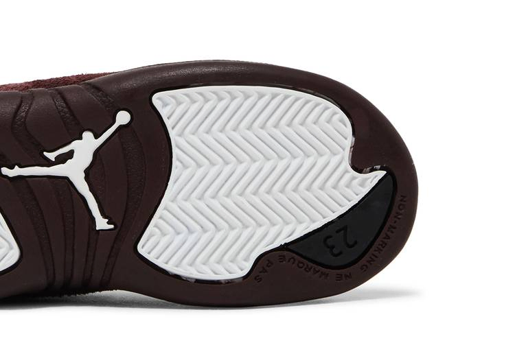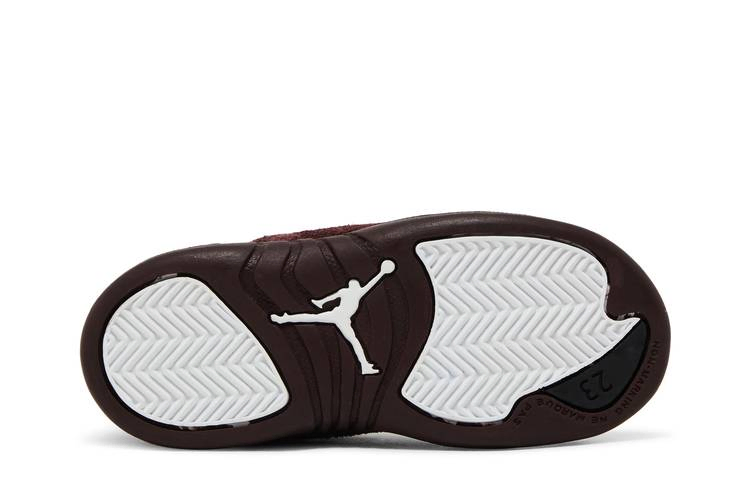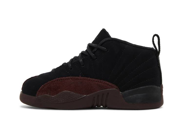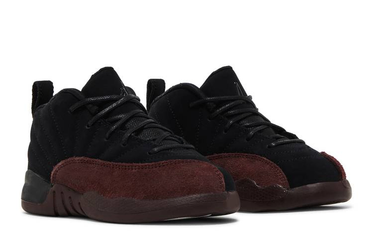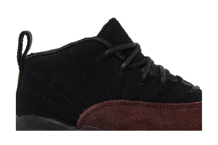 Созданные для самого юного фаната Jordan в семье, A Ma Maniére x Air Jordan 12 Retro SP TD 'Black' представляют собой роскошную интерпретацию чемпионского силуэта. Джеймс Уитнер и компания одели унаследованную модель в черный прошитый нубук с накладками из ворсистой замши цвета Burgundy Crush. Вощеные шнурки и стеганая подкладка подчеркивают возвышенный вид обуви. Помимо обновленных задников, уникальные элементы брендинга включают тональный Jumpman и логотип A Ma Maniére на несовпадающих язычках. Резиновая подошва бордового цвета с белыми елочками для лучшего сцепления с поверхностью.
