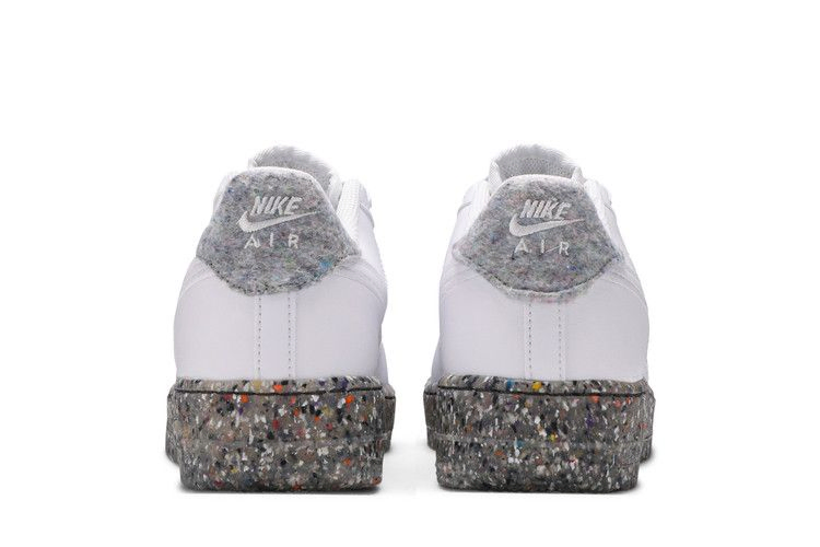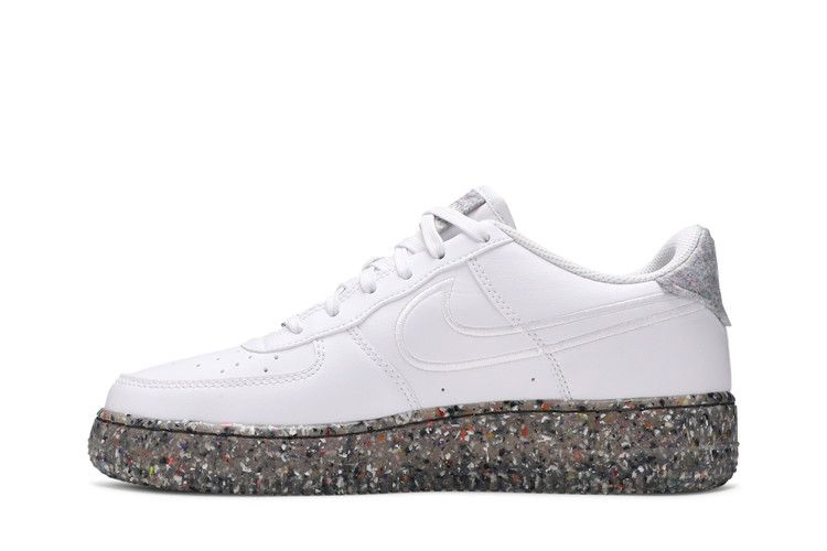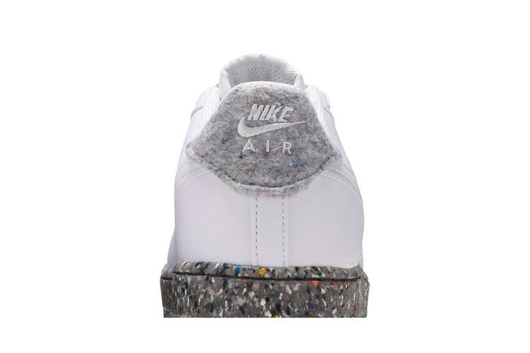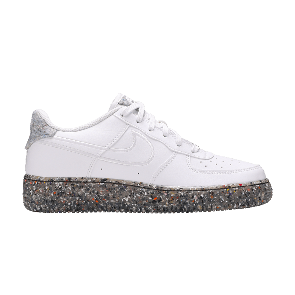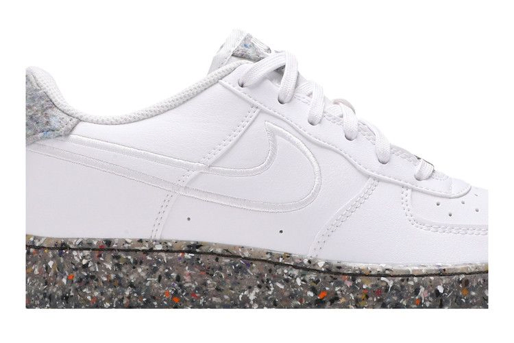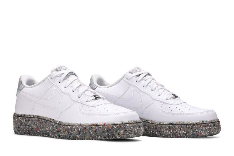 Модель Nike Air Force 1 GS "White", представленная в школьном размере, взята из коллекции "Recycled Wool Pack", в которой собраны классические силуэты, изготовленные из экологически чистых материалов. Однотонные белые кроссовки с верхом из искусственной кожи, в состав которой входит не менее 25 % переработанных волокон. Шнурки изготовлены из 20% переработанного полиэстера, а ворсистый материал на язычке и пятке - из 100% переработанного сырья. Уникальный вид пятнистой подошвы указывает на использование технологии Nike Grind, в которую входят резиновые отходы, являющиеся побочным продуктом производства кроссовок.