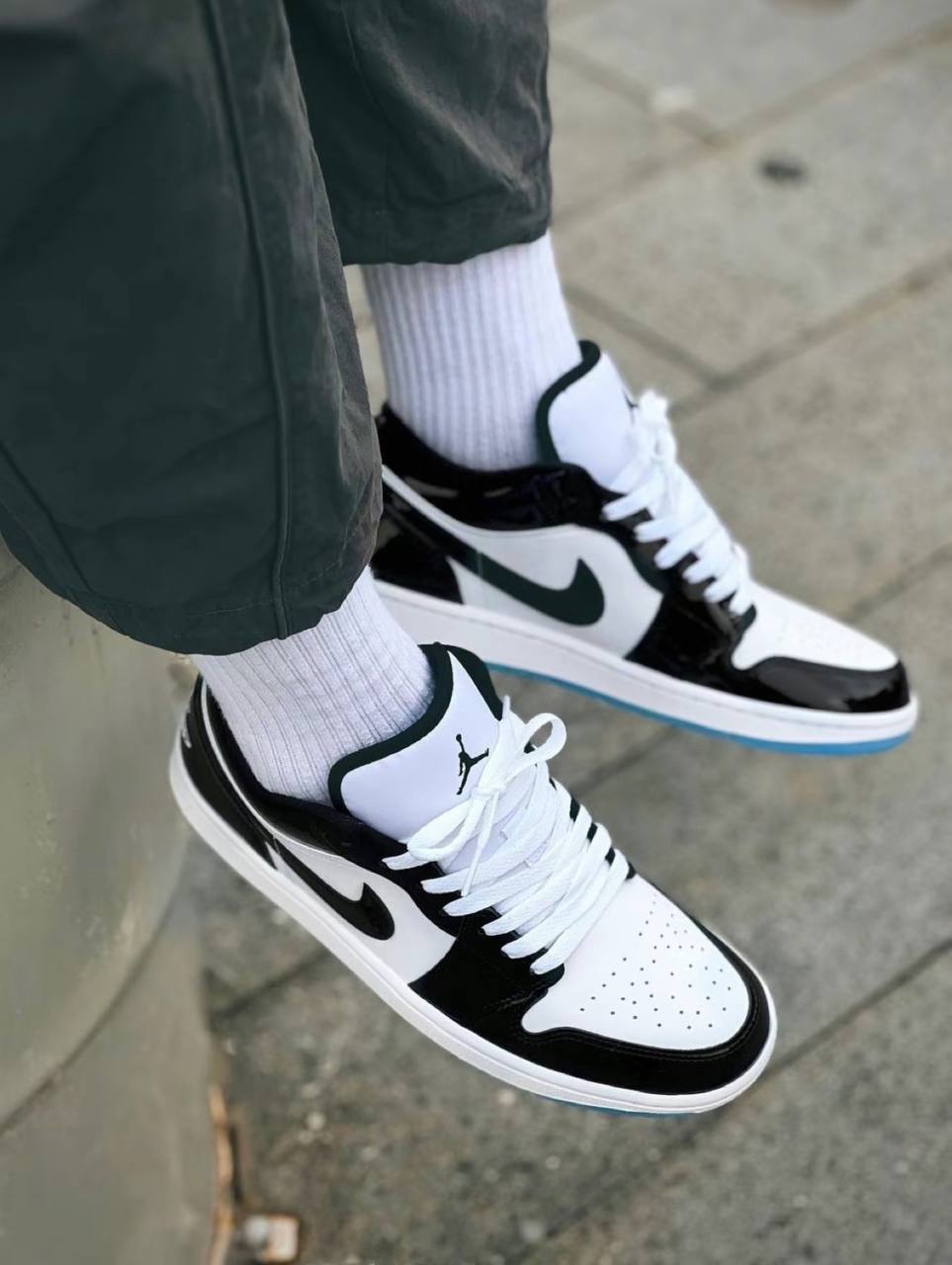 Модель Air Jordan 1 Low SE GS Concord, предлагаемая в подростковых размерах, представляет собой нестареющий дизайн в черно-белом исполнении. Полностью кожаный верх сочетается с белой основой и контрастными черными накладками на носке и пятке. Фирменные элементы включают вышитый значок Jumpman на язычке и пришитый логотип Wings на задней части пятки. Винтажная мидсоль из белой резины оснащена блоком Air-sole в пятке для легкой амортизации, а подошва из голубой резины имеет гибкие канавки для естественного шага.