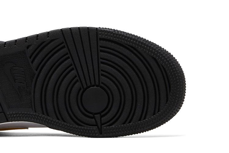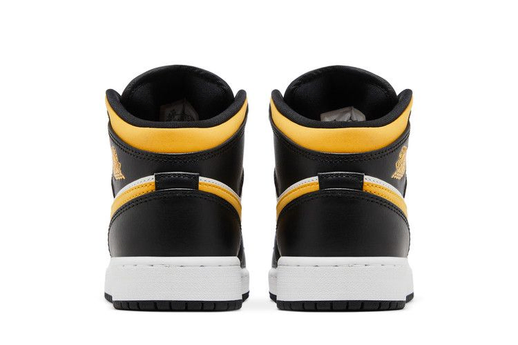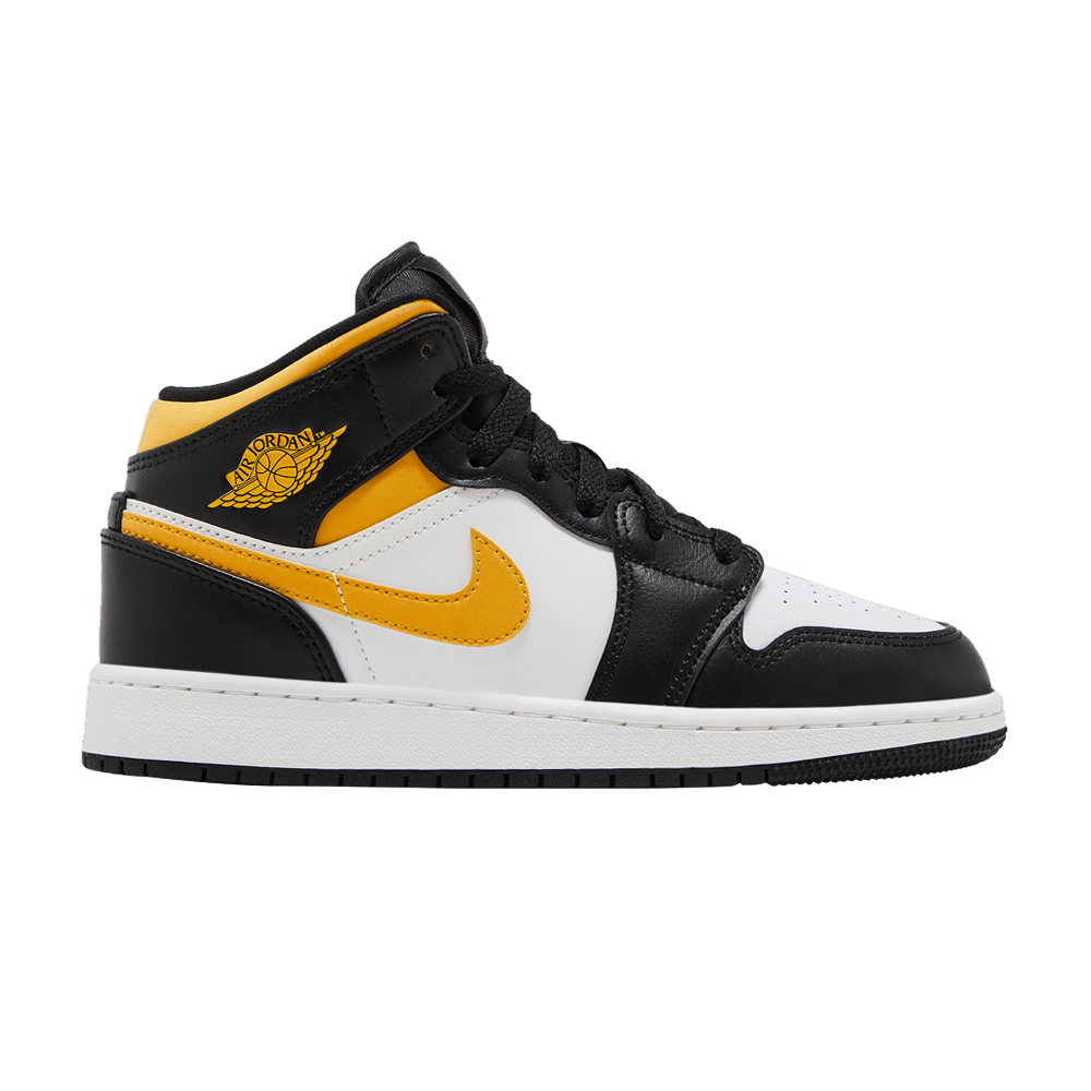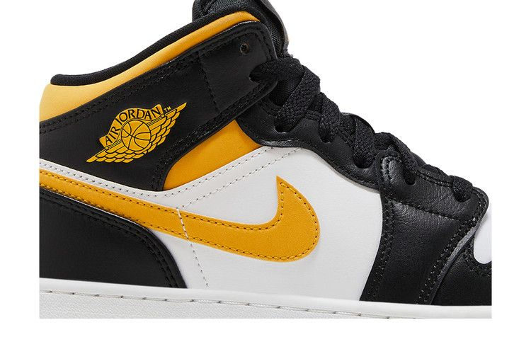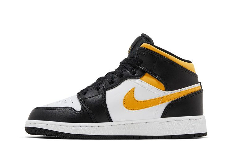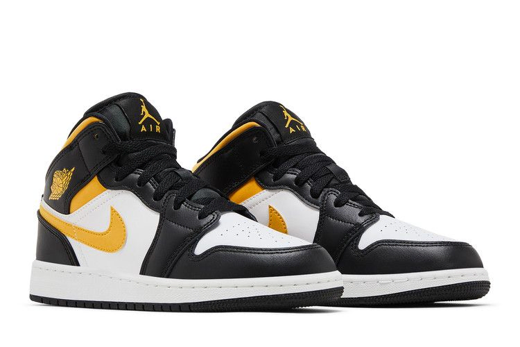 Модель Air Jordan 1 Mid GS "Black University Gold", представленная в школьном размере, демонстрирует знакомые цветовые блокировки на классическом силуэте, созданном по образцу основополагающей модели, с которой все началось. Гладкая кожа используется в верхней части, которая сочетает в себе четкую белую основу с черными накладками на носочной и пяточной частях. Контрастные желтые цвета украшают мягкий воротник и фирменную надпись Swoosh. Дополнительные элементы брендинга включают значок Jumpman на тканом язычке и логотип Wings на боковой лодыжке. Модель стоит на белой и черной резиновой подошве с амортизацией Nike Air в пятке.