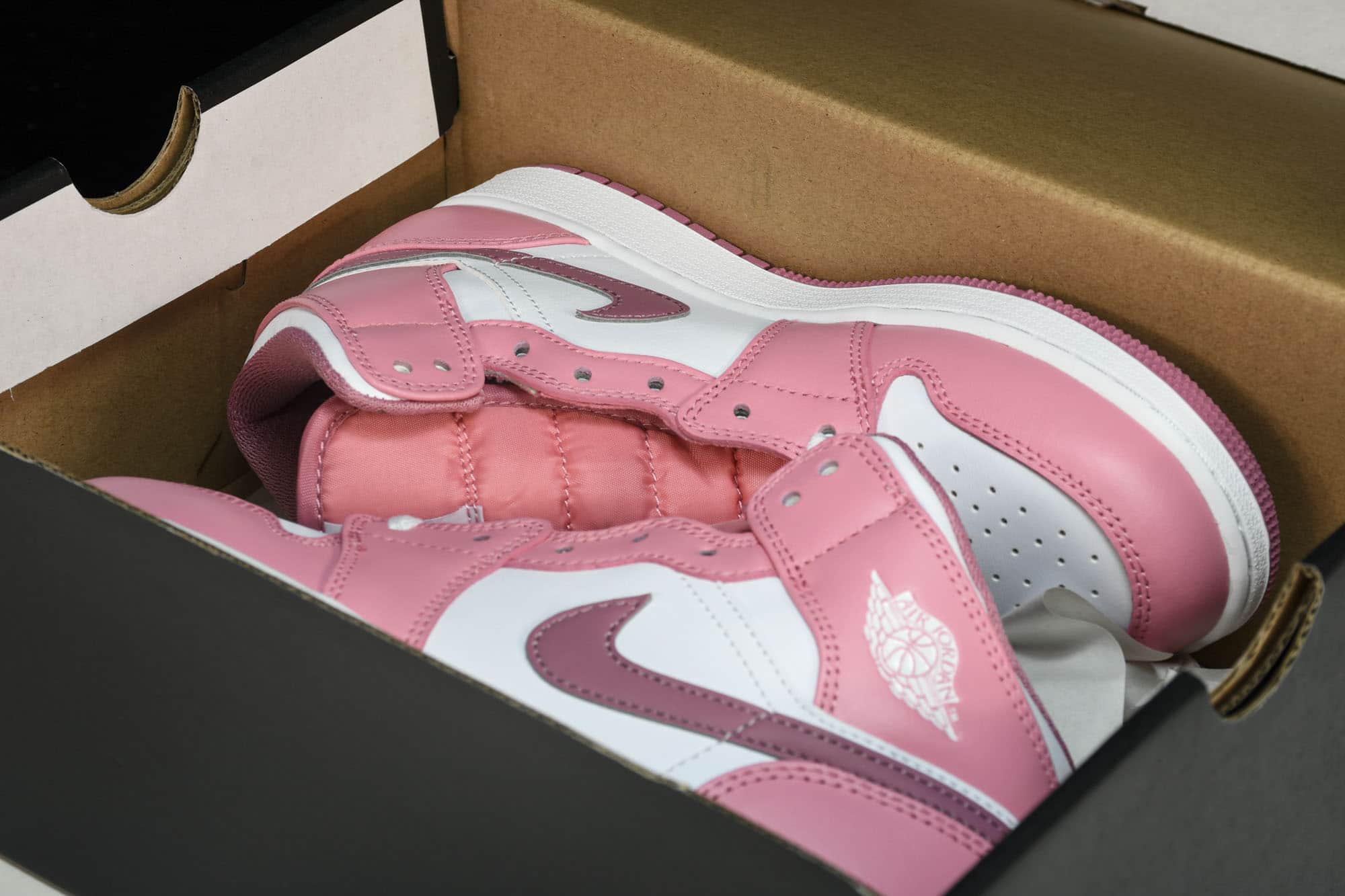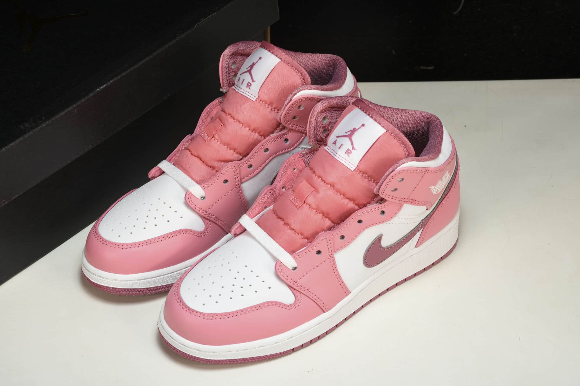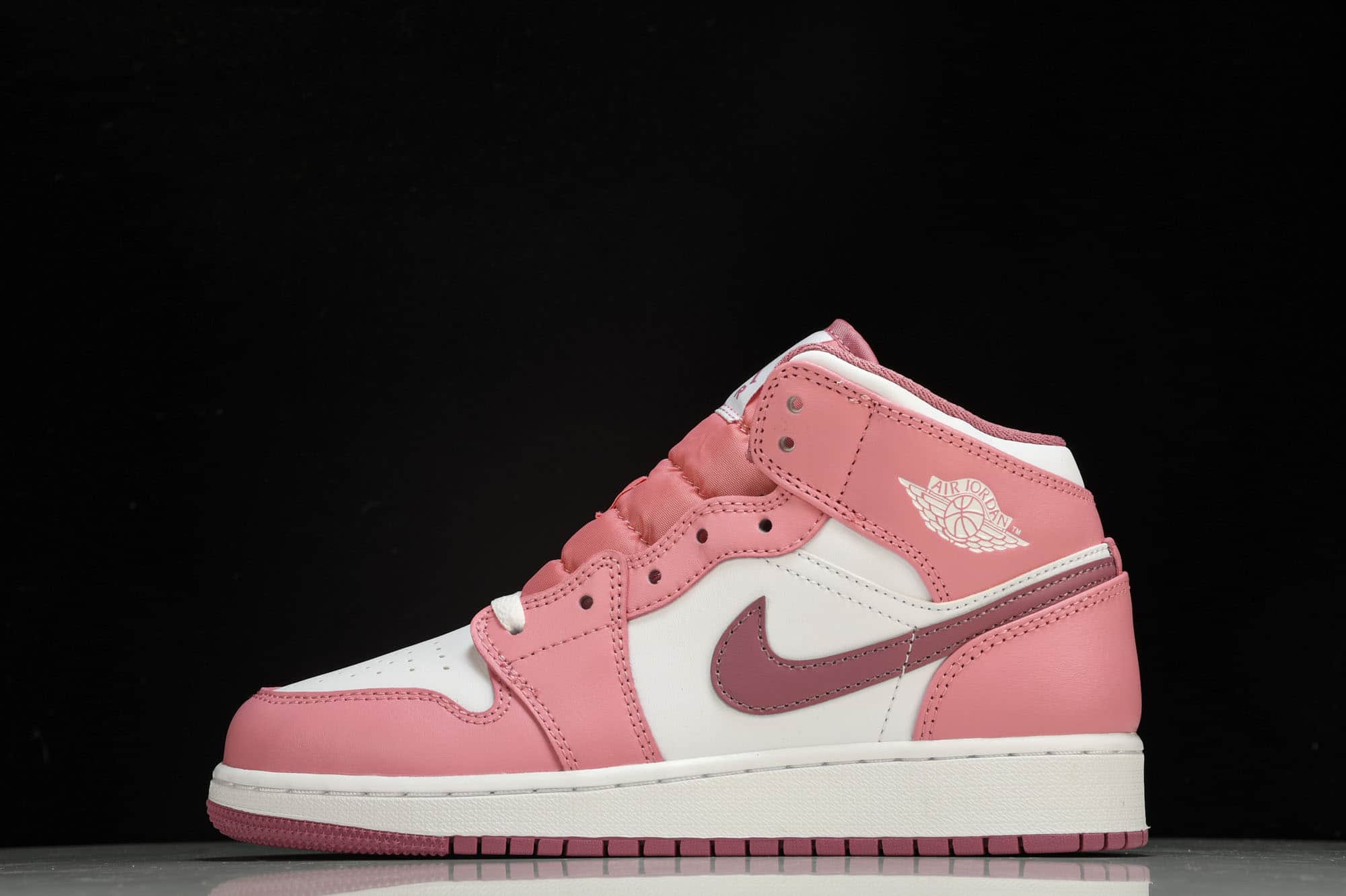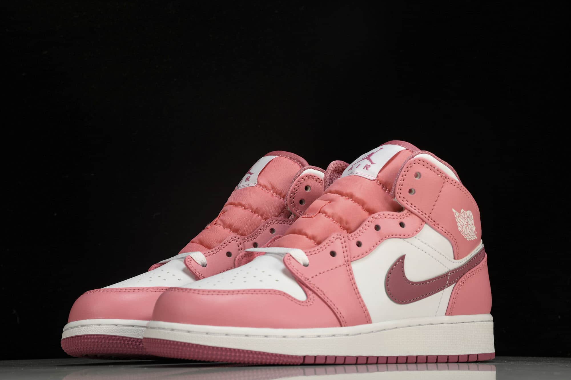 Силуэт Air Jordan 1 Mid GS Valentine's Day 2023 демонстрирует знакомую цветовую схему. Верх из гладкой кожи сочетает белые панели с контрастными накладками розового цвета. Розовые акценты расположены на носке, среднем воротнике. Резиновая подошва верна оригинальному дизайну 1985 года и дополнена подошвой Air-sole, заключенной в легкий полиуретан.- Цвета: Coral Chalk/Desert Berry/White