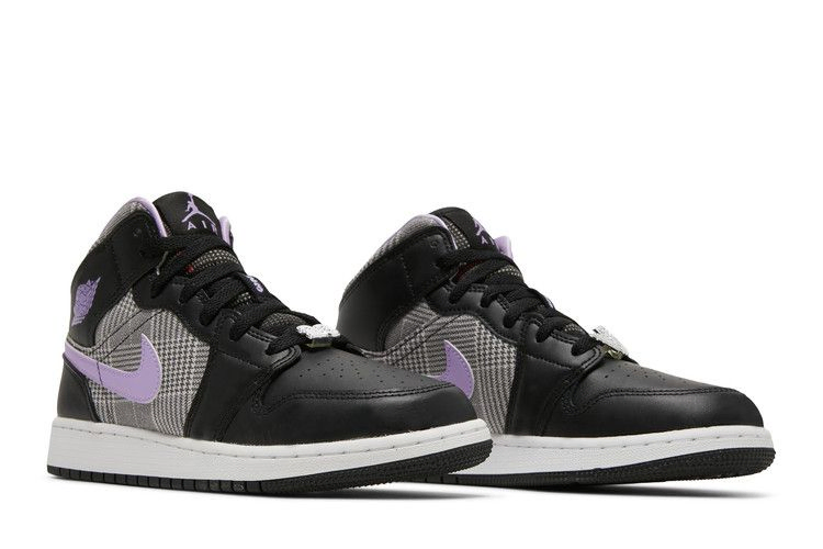 Модель Air Jordan 1 Mid SE GS "Houndstooth", доступная исключительно в детских размерах, сочетает в себе ретро-стиль с узорчатыми акцентами из мира одежды на заказ. Верхняя часть сочетает в себе гладкую черную кожу и серый текстиль с узором "хаундстаут" на четверти и воротнике. Тонкие вкрапления лавандового цвета выделяют брендинг, включая кожаный логотип Swoosh, язычок Jumpman и графику Wings, нанесенную на боковую лодыжку. Второй логотип Wings расположен на серебристом металлическом шнурке, а также литая цифра "23".