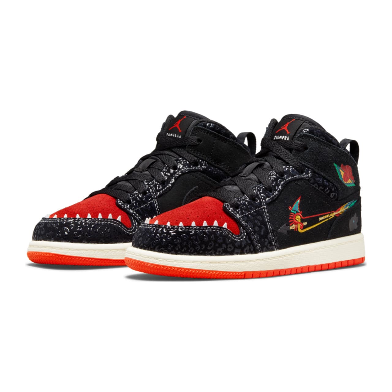 Созданная для детей модель Air Jordan 1 Mid SE PS SiEMPRE Familia взята из коллекции 2021 года Día de Muertos, в которой представлены унаследованные силуэты обуви, объединенные темой семейных уз. Этот специальный выпуск AJ1 украшен тональным принтом ягуара на черном замшевом верхе. Детали, напоминающие зубы, обрамляют красную замшу на носке, а боковая часть Swoosh украшена многоцветной вышивкой с изображением стрелы. Слова "Siempre" и "Familia" сопровождают красный логотип Jumpman на каждом тканом язычке.- Цвета: Black/Sail/Roma Green/Chile Red