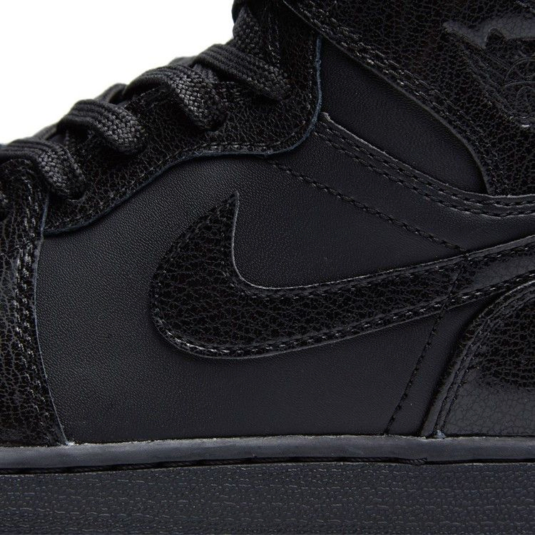 Модель Air Jordan 1 представлена в утонченном варианте с черным цветом накладки из гладкой и полированной кожи. В контрасте с бежевыми акцентами на языке и подошве Nike, кроссовки имеют классическую промежуточную подошву Jordan 1 с Nike Air в пятке.