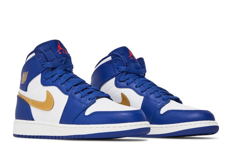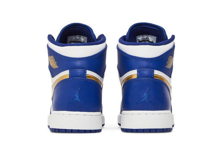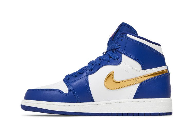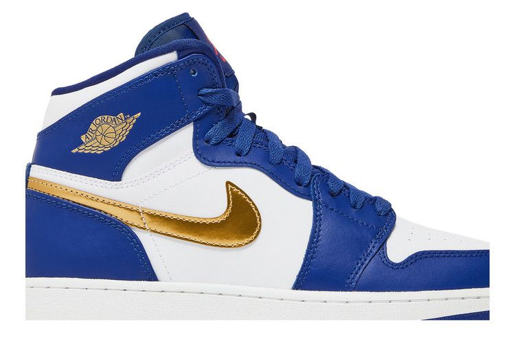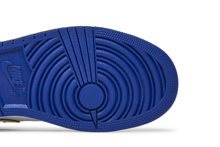 Выпущенные в июле 2016 года в преддверии летних Олимпийских игр в Рио-де-Жанейро в следующем месяце, эти Air Jordan 1 Retro High BG имеют золотисто-металлический Swoosh в качестве кивка на медаль за первое место. Остальная часть верха выполнена из белой кожи, дополненной накладками из кожи королевского синего цвета и золотым логотипом Air Jordan 'Wings', украшающим воротник. Логотип Jumpman на тканом язычке придает контрастный красный оттенок.