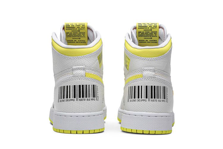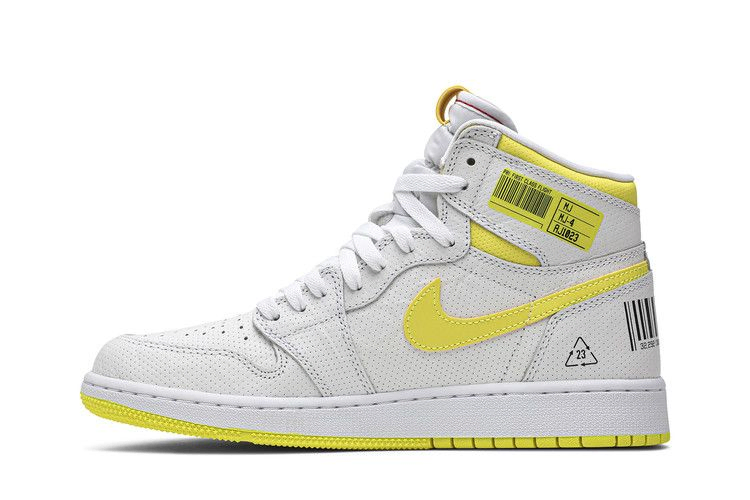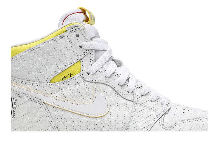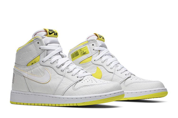 Верхняя часть Air Jordan 1 Retro High OG GS "First Class Flight" выполнена из белой кожи с перфорацией и настоящей перфорацией на носке. На этой модели, разработанной Питером Муром, есть логотип Wings, впервые появившийся в 1985 году на оригинальных Air Jordan 1. Эта баскетбольная обувь, выпущенная в сентябре 2019 года, имеет и другие уникальные визуальные элементы, включая подпись Майкла Джордана и черные штрих-коды на пяточной панели. Символ переработки с цифрой "23" в центре отдает дань уважения номеру джерси Джордана.