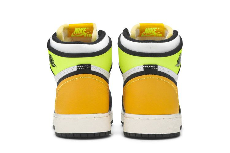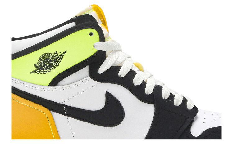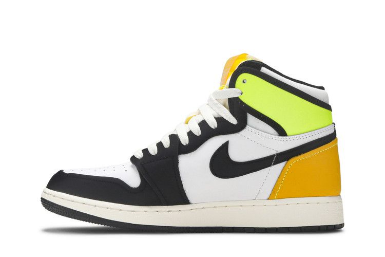 Созданные для больших детей, Air Jordan 1 Retro High OG GS 'Volt Gold' сочетают в себе деконструированные детали и диссонирующие акценты, взятые из прошлых моделей Air Jordan 1, в результате чего получается обновленный вариант кроссовок, с которых все началось. Верхняя часть кроссовок выполнена из белой кожи с контрастной черной кожей на носочной части и Swoosh. Пяточная панель выполнена в цвете University Gold, а отстегивающиеся накладки на воротник - в черном и Volt. На воротнике и язычке использован открытый пеноматериал, последний украшен перевернутой полупрозрачной биркой.