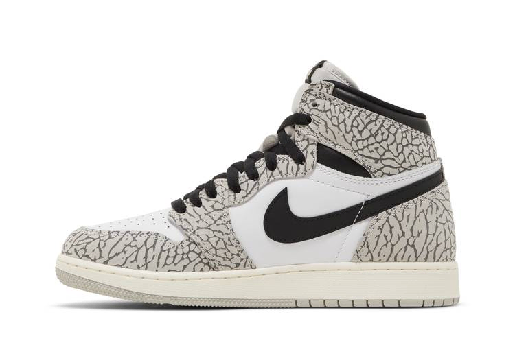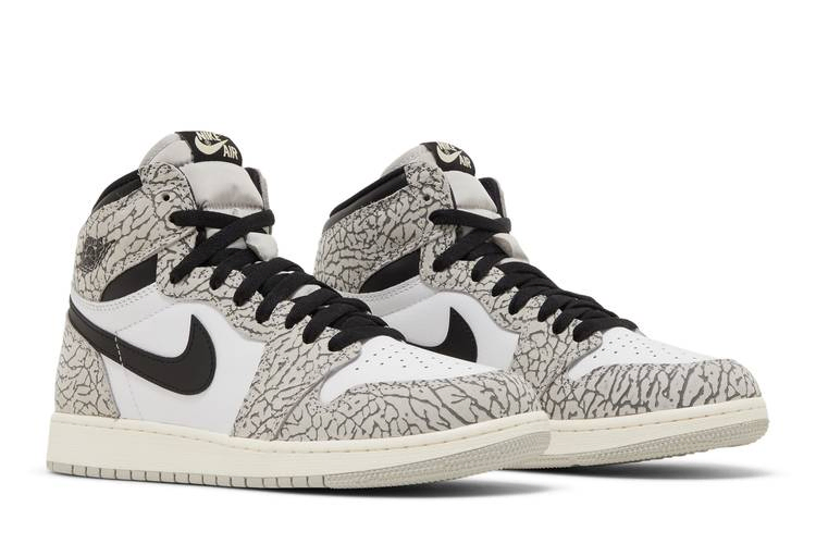 Созданные для больших детей, Air Jordan 1 Retro High OG GS 'White Cement' демонстрируют характерный принт, созданный Тинкером Хэтфилдом и представленный миру на Air Jordan 3. Дебютные фирменные кроссовки Майкла Джордана имеют белый кожаный верх с серыми накладками с принтом слона и черным кожаным логотипом Swoosh. Язычок из воздухопроницаемого нейлона украшен тканым ярлыком Nike Air, а на боковой лодыжке вытиснен ретро-логотип Wings. Межподошва выполнена в белом цвете, что подчеркивает винтажную эстетику кроссовок.