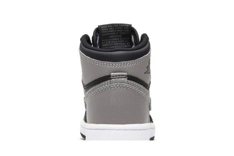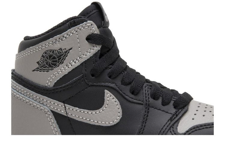 Air Jordan 1 Retro High OG PS 'Shadow' - детская версия популярного в 2018 году переиздания кроссовок, которые Майкл Джордан носил в свой первый сезон, с верхом из галтованной кожи и надписями Swooshes на боковых панелях. Хотя основными цветами первых итераций AJ были красный и синий, в этой версии использованы другие оттенки, на которые также стали ориентироваться дизайнеры Nike. Черный цвет преобладает на заднике, язычке и брызговике, а серый - на голеностопе, пятке, носочной части и Swoosh.
