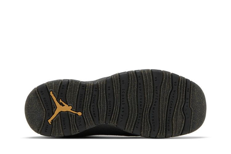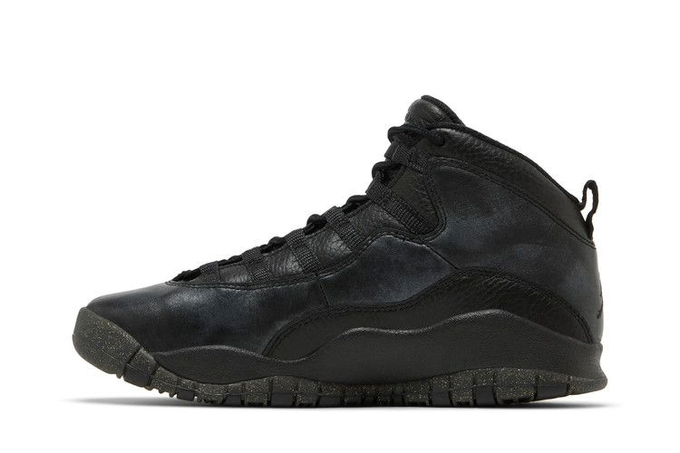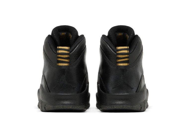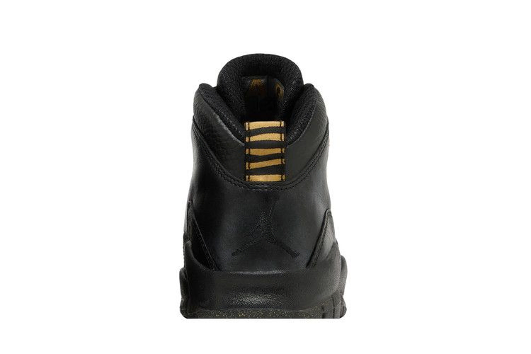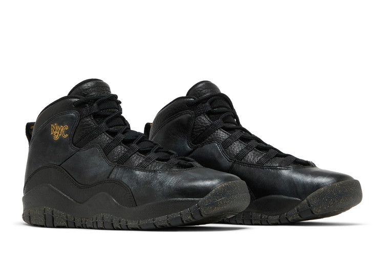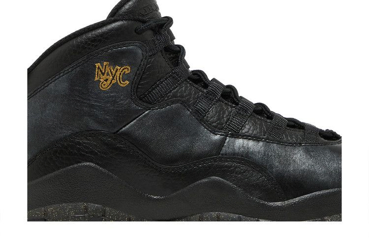 Модель Air Jordan 10 Retro BG 'NYC', выпущенная в 2016 году в рамках возрождения оригинальной концепции городской серии, отдает дань уважения Большому яблоку. Дизайн вдохновлен городом благодаря использованию многофактурного черного кожаного верха и резиновой подошвы в крапинку темно-серого цвета. Вышивка 'NYC' и полосатая петля на пятке контрастируют с золотым цветом.