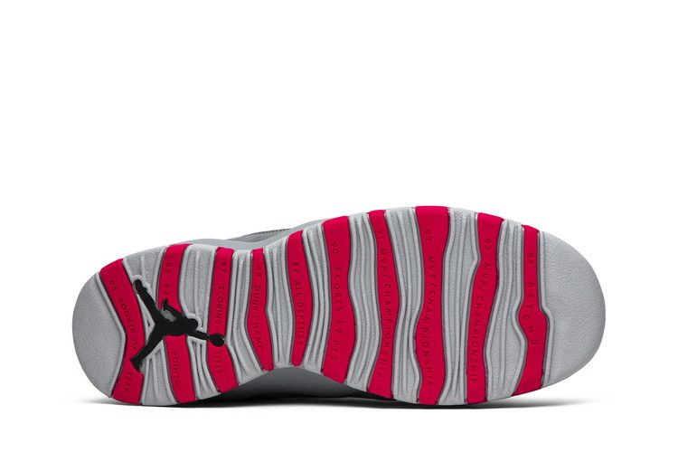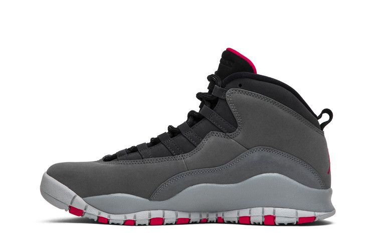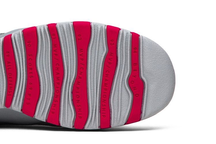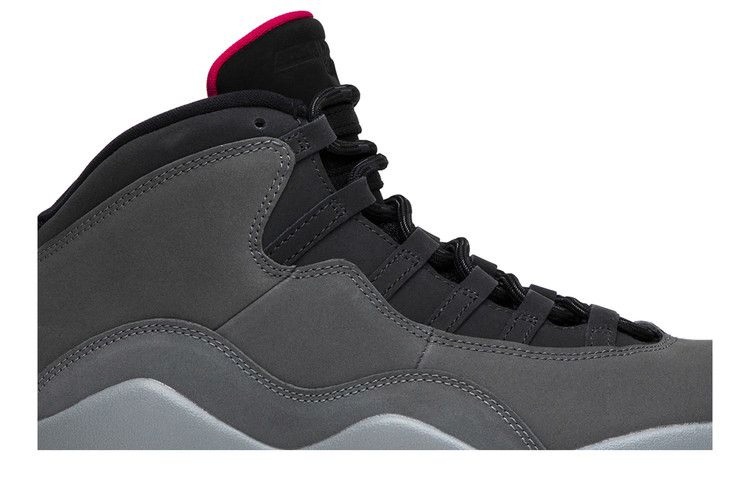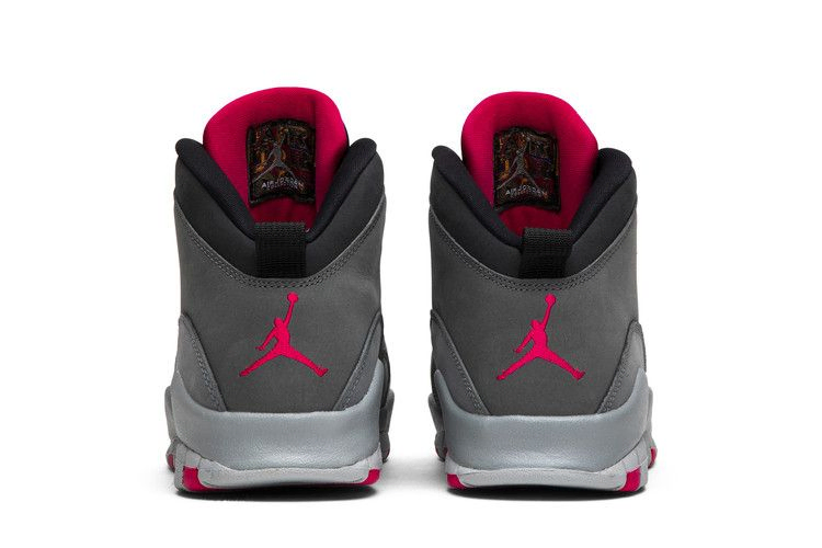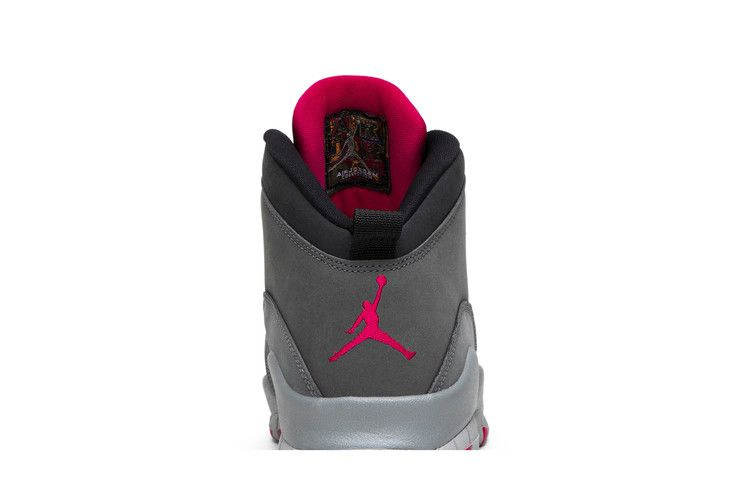 Модель Air Jordan 10 Retro GS "Smoke Grey" выполнена в приглушенном цветовом решении, состоящем из различных оттенков серого цвета в верхней части из нубука. На черном кожаном язычке с внутренней стороны красуется оттенок Rush Pink, а яркий оттенок повторяется на логотипе Jumpman на пятке. Этот оттенок также использован на подошве, которая рассказывает о некоторых вехах ранней карьеры MJ.