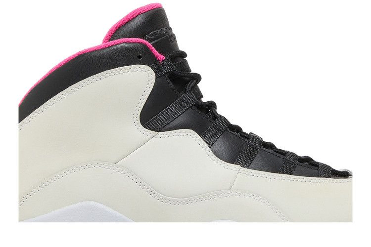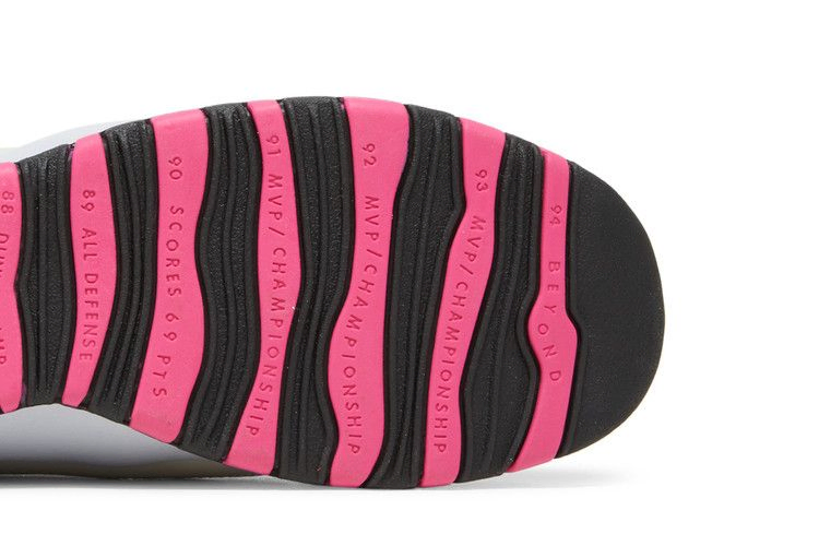 Это школьное издание Air Jordan 10 Retro GG "Vivid Pink" вышло в мае 2016 года. Модель выполнена из белой кожи с черным горлом и акцентами Vivid Pink на подкладке и значке Jumpman. Еще один розовый оттенок присутствует на подошве, где изображены стилизованные полоски с некоторыми достижениями Майкла Джордана за его карьеру.