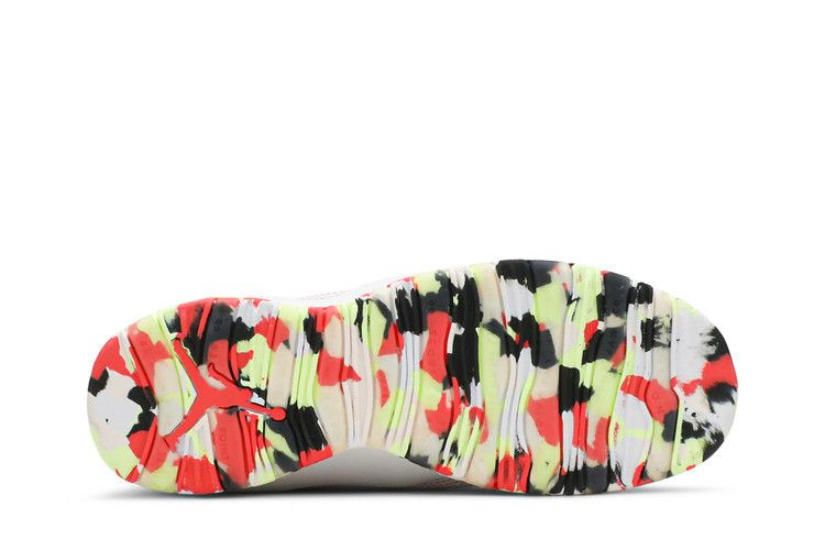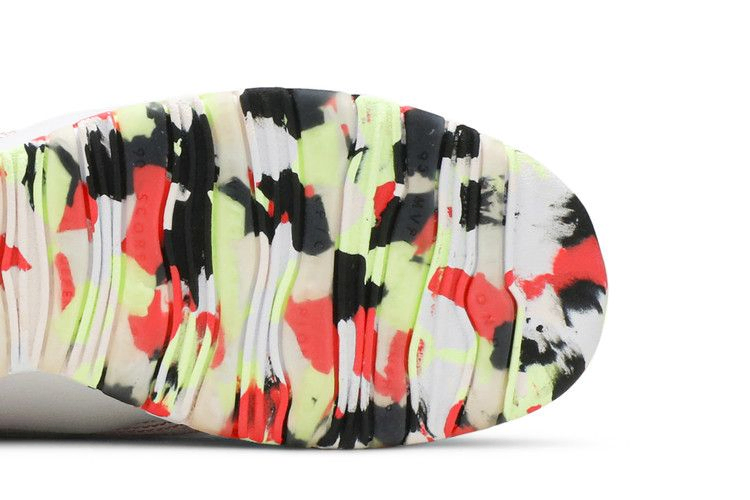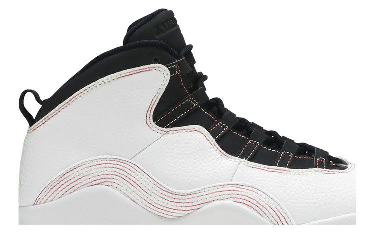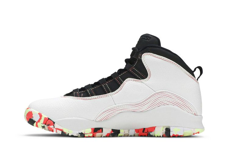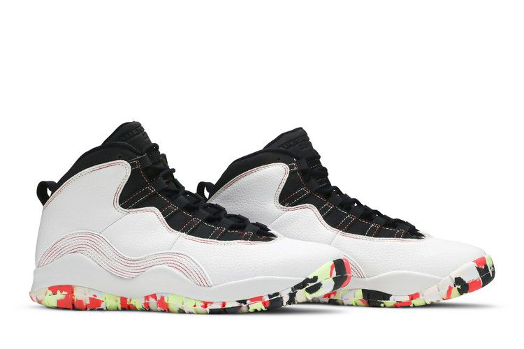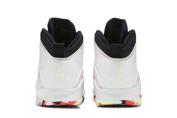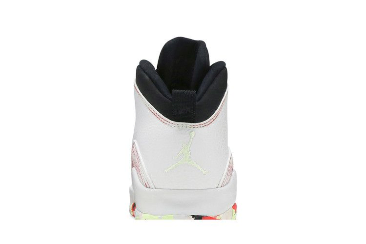 Air Jordan 10 Retro GS "Ember Glow" - это обновленная версия модели AJ10, которая дебютировала в 1994 году, когда Эм-Джей был в перерыве между выступлениями в НБА. Выпущенные 1 июля 2019 года, эти детские кроссовки выполнены в электрической цветовой гамме из белого, Barely Volt, черного и Ember Glow оттенков. Язычок, шнурки, выступ на пятке и воротник вокруг лодыжки выполнены в черном цвете, а верхняя часть состоит из белой кожи. Все элементы цветовой гаммы собраны вместе на камуфляжной подошве, чтобы завершить образ.