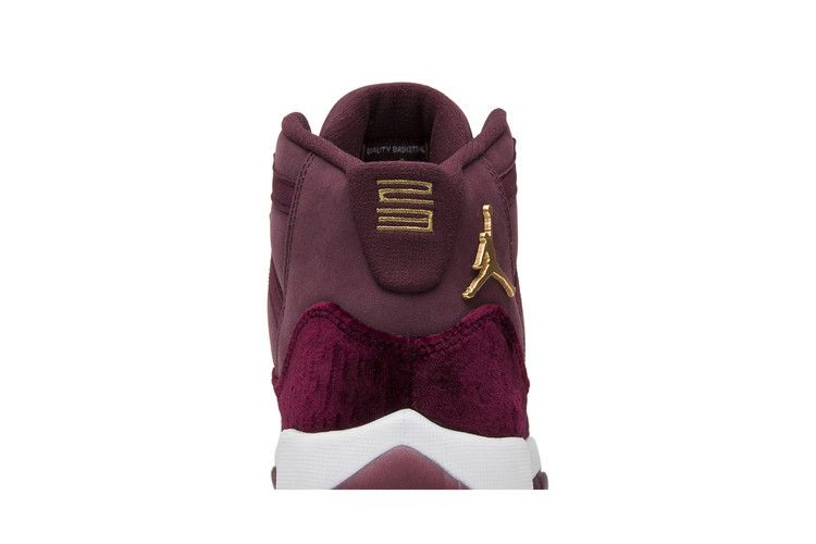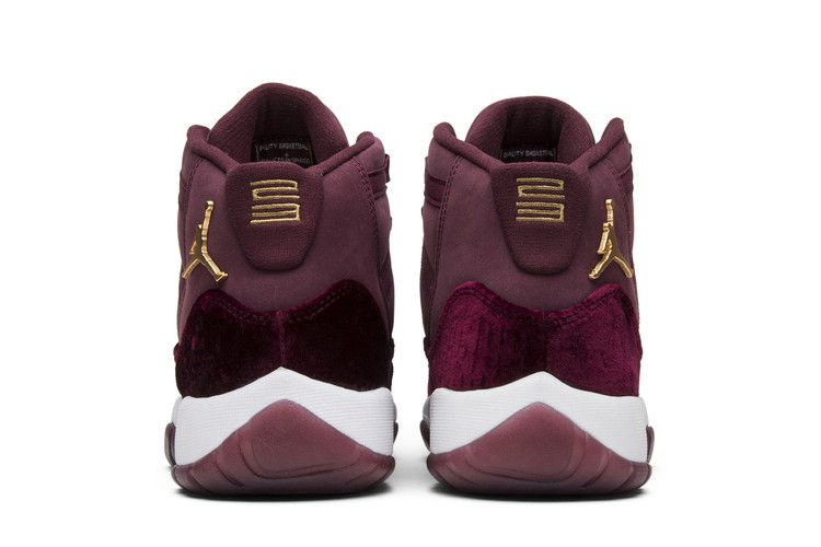 Air Jordan 11 Retro GG Heiress 'Velvet' - икона кроссовок в роскошном исполнении с позолоченными акцентами. Насыщенный бордовый оттенок заливает верх из мягкого нубука с плюшевой накладкой из мятого бархата. Контрастные золотисто-металлические элементы брендинга кроссовок, включая литой логотип Jumpman и вышитую цифру "23" на язычке пятки. Кроссовки опираются на мягкую белую подошву Phylon, которая поддерживается полупрозрачной резиновой подошвой.
