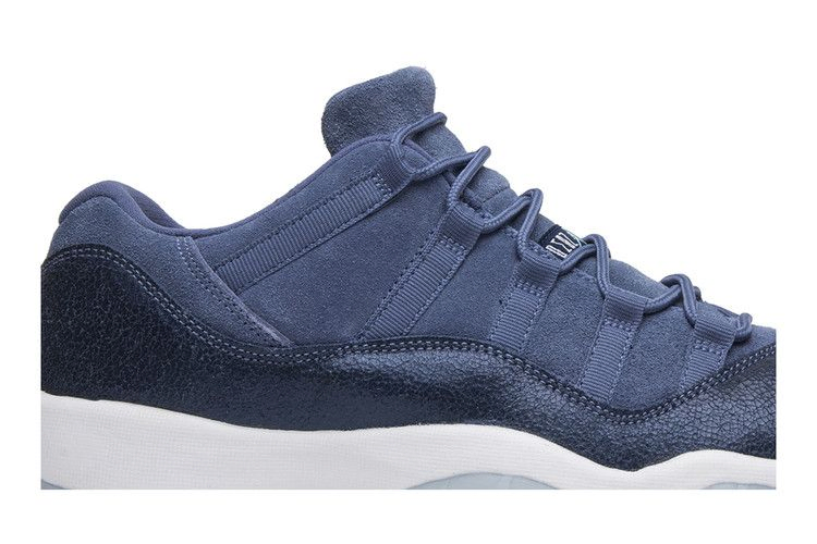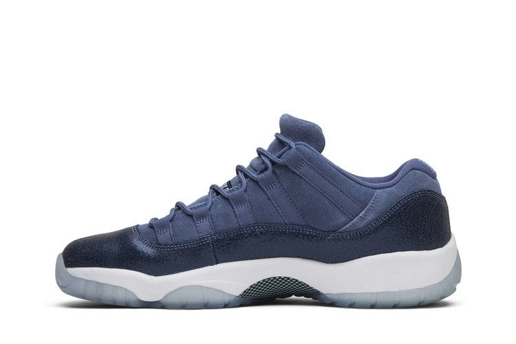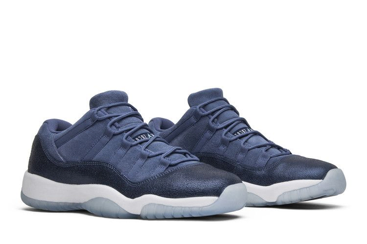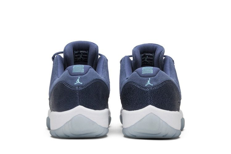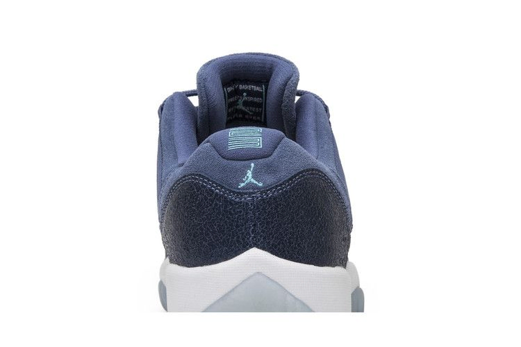 Выпущенная в 2017 году модель Air Jordan 11 Retro Low GS "Blue Moon" отдает дань уважения альма-матер Джордана, Университету Северной Каролины, благодаря возвышенной эстетике и премиальным материалам в школьных размерах. Сверху в дизайне сочетаются мягкая синяя замша премиум-класса и текстурированная темно-синяя лакированная кожа. Под ногами белая промежуточная подошва и подошва ледяного синего цвета, а также акценты темно-синего цвета и брендинг Jumpman в ярких цветах Каролины.