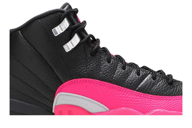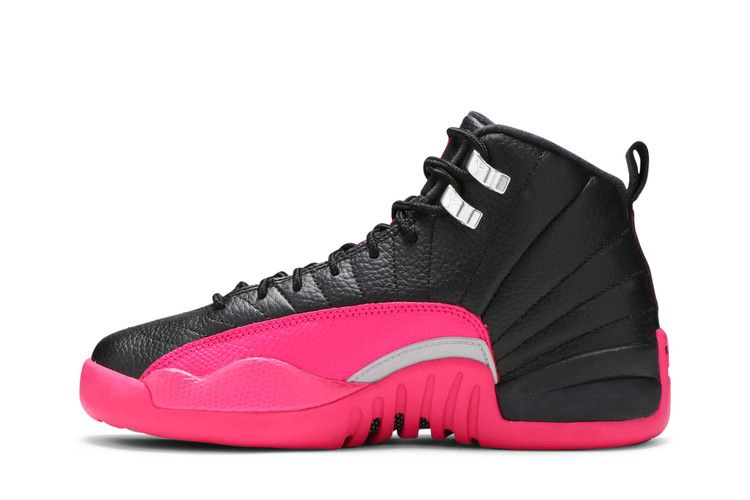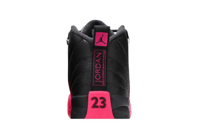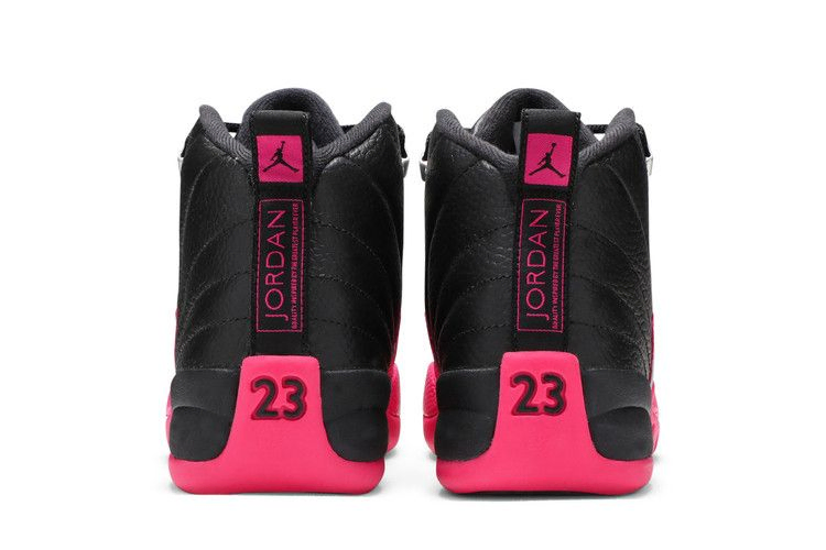 На брызговике и подошве этих Air Jordan 12, вышедших в 2017 году в школьном размере, нанесен яркий розовый цвет Deadly Pink. Верх из черной кожи служит контрастным фоном, а серебристые люверсы расположены в верхней части кроссовка. Смертельно-розовые акценты украшают язычок, включая фирменную надпись "Two 3". Черная пластина голенища из углеродного волокна проглядывает сквозь ребристую часть подошвы, завершая дополнительный цветовой ряд.