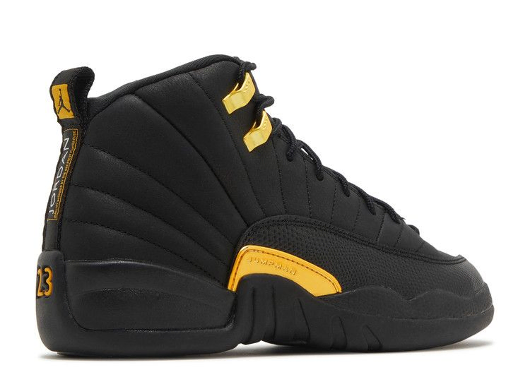 Модель Air Jordan 12 Retro GS "Black Taxi" представляет собой скрытую расцветку унаследованного силуэта, созданную для больших детей. Верхняя часть выполнена из гладкого черного нубука, украшена простроченными линиями и дополнена тональными синтетическими брызговиками с тонкой текстурой ящерицы. Помимо верхних люверсов, золотые акценты Taxi украшают логотип Jumpman на язычке, фирменные вставки на пятке и накладки на носок с тиснением Jumpman. Легкая амортизация обеспечивается черной подошвой из пеноматериала, голенищем из углеродного волокна и подошвой Air в пятке.