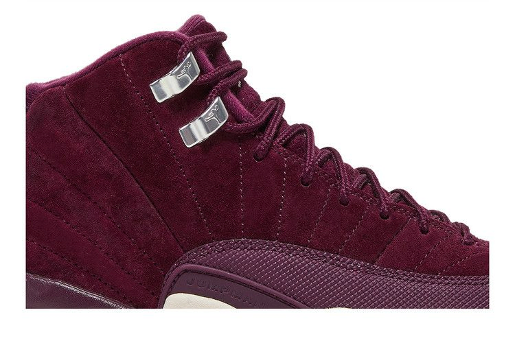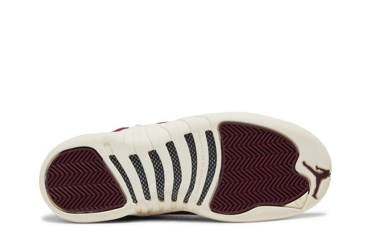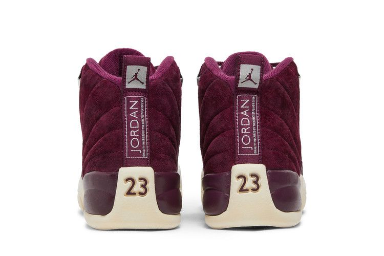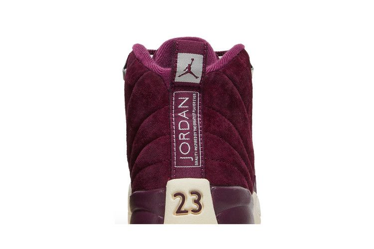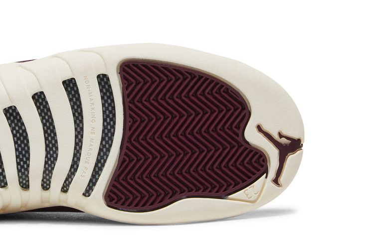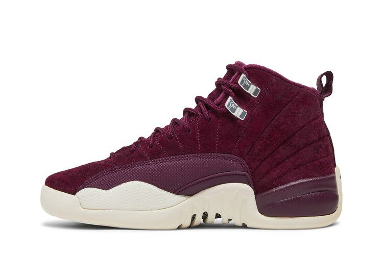 Ретро-кроссовки Air Jordan 12 Retro в насыщенном цвете бордо стали доступны школьникам. Фирменный цвет присутствует на замшевом верхе, а также на брызговике и "Jumpman" на подошве. Резкий контраст обеспечивает подошва из парусины, на которой размещен Zoom Air, а также брендинг на язычке. На ребристой подошве видна пластина голенища из углеродного волокна.