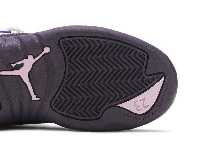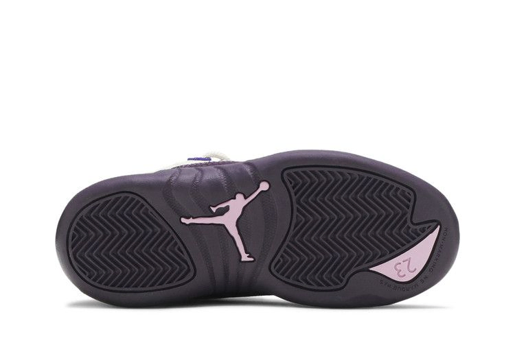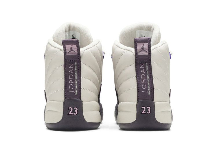 В 1996 году Air Jordan 12 стали первыми полностью фирменными Jordan - и первыми без Swoosh. Модель Nike Air Jordan 12 Retro PS "Desert Sand" отдает дань уважения оригиналу в размере для маленьких ножек. Верх выполнен из кожи со смещенной накладкой из фиолетового материала, похожего на тканый твид. На пятке в ряд расположены три логотипа Jordan фиолетового цвета, которые сочетаются с двухцветной подошвой и стелькой.