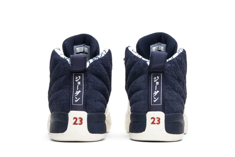 Эти Air Jordan 12 дошкольного размера выпущены в варианте International Flight, который отдает дань уважения всемирному влиянию Майкла Джордана. В частности, она посвящена поездке Майкла Джордана в Токио в 1996 году для проведения баскетбольной клиники. Верх кроссовок выполнен в цветочном принте Obsidian и украшен брызговиками из кожи рептилий в цвете Sail. Дань уважения дополнена красными логотипами на язычках и японскими надписями на пятках.