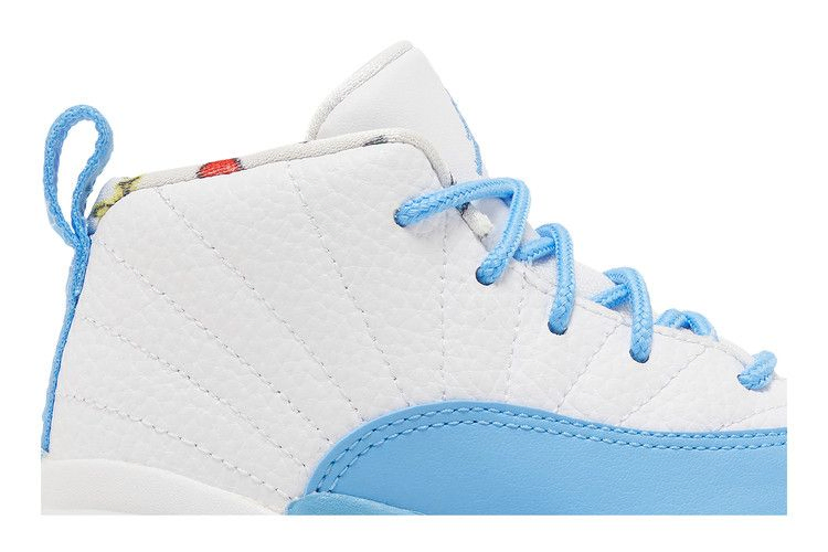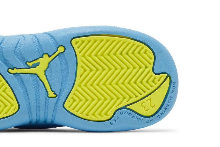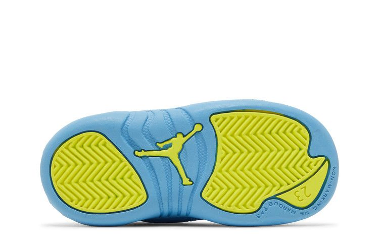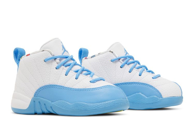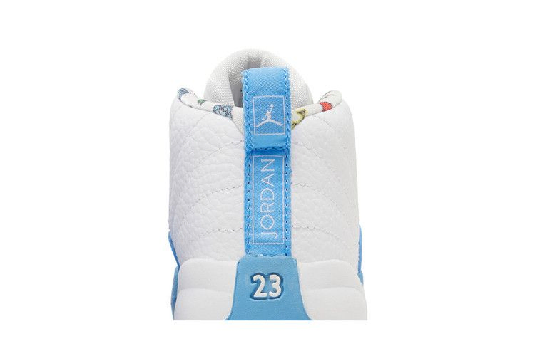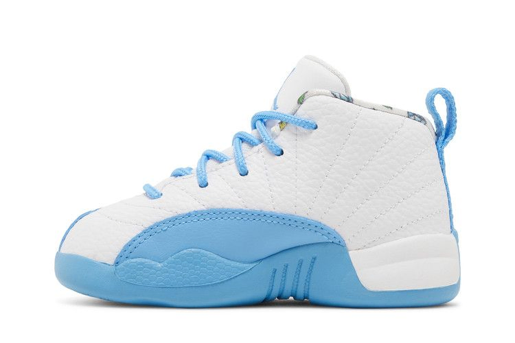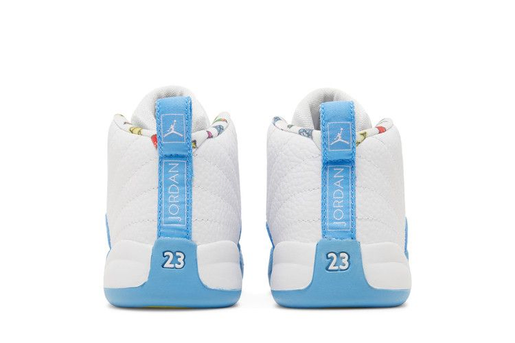 Air Jordan 12 Retro TD 'Emoji' обновляет ретро-силуэт, добавляя игривые детали и привычную двухцветную палитру. Верхняя часть кроссовок изготовлена из белой кожи, украшенной тональной строчкой и усиленной брызговиком цвета University Blue. Вышитый брендинг Jumpman украшает язычок, а многоцветная графика видеоигр - боковую часть пятки и подкладку воротника. Подошва из синей резины оснащена сцепными элементами в виде елочки цвета Lemon Venom.