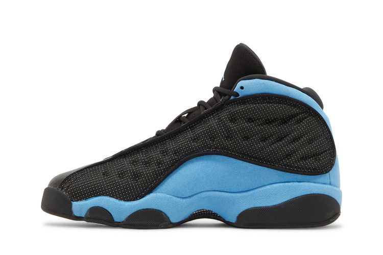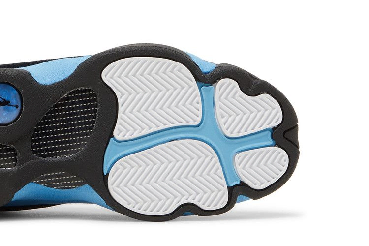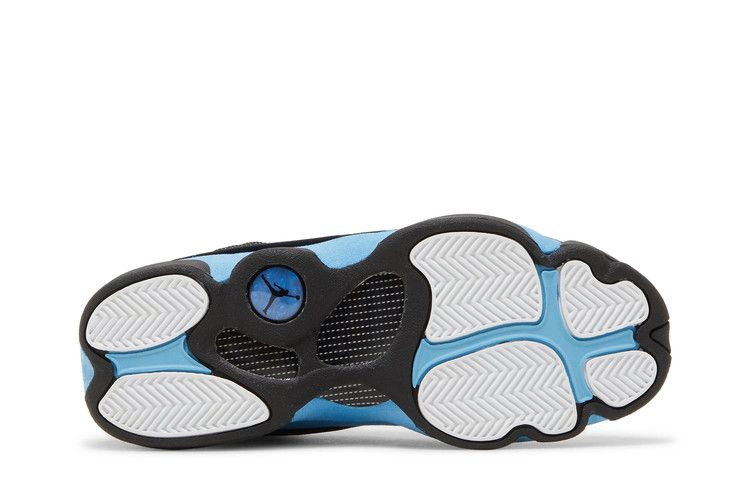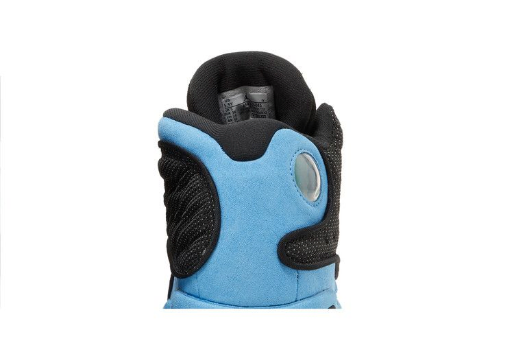 В силуэте Air Jordan 13 Retro GS "Black University Blue" использованы акценты в духе Каролины, а дизайн позаимствован у "Черного кота" Майкла Джордана. Верхняя часть из смешанных материалов включает в себя черную кожу с потертостями по всей передней части стопы, пару черных сетчатых накладок со светоотражающими деталями и замшевые панели в энергичном синем цвете. Хищная кошачья тематика обуви продолжена голографическим значком в виде кошачьего глаза и подошвой в форме елочек, напоминающей лапу пантеры.
