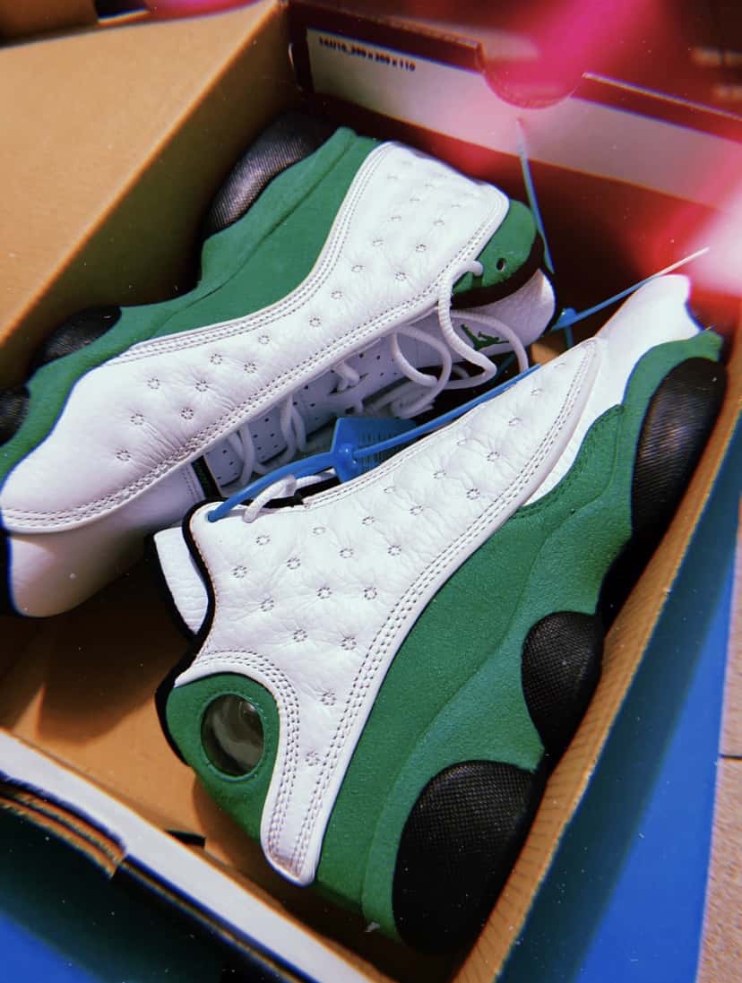 Созданные для больших детей, Air Jordan 13 GS «Lucky Green» имеют двухцветную цветовую схему, которая напоминает PE Рэя Аллена 2011 года. Как и в старых кроссовках, эта пара сочетает в себе белую гладкую кожу с вставками из синтетической замши c контрастной зеленой отделкой. Изменения включают черные детали на подкладке и резиновой подошве, а также традиционный логотип Jumpman вместо подписи Рэя Аллена на язычке. Ознакомьтесь с подробными фотографиями и закажите эту расцветку Air Jordan 13 Retro GS Lucky Green в розничных магазинах или в сервисе Slamdunk.- Цвета: White/Black/Lucky Green