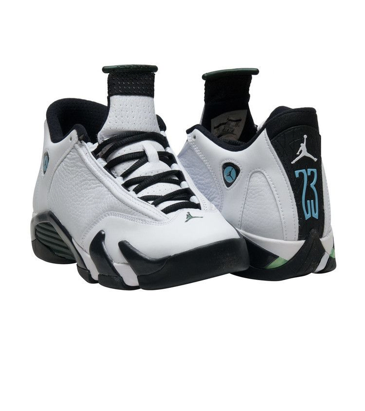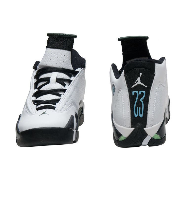 Последняя модель Jordan, которую Майкл Джордан носил, завоевывая титул чемпиона НБА. Модель Jordan 14 отличается более низким кроем, созданным для скорости и контроля. Верхняя часть из белой кожи контрастирует с черными акцентами на промежуточной подошве, шнурках и носочной части, а голограммный значок на воротнике выполнен в цвете Legend Blue. Кроме того, в кроссовке используются сдвоенные Zoom и вентиляция в подошве.
