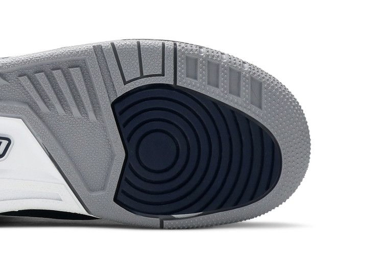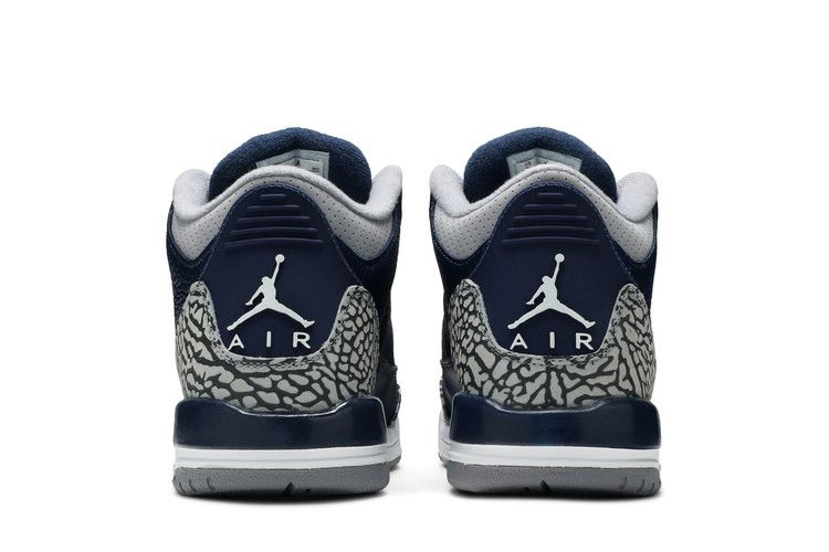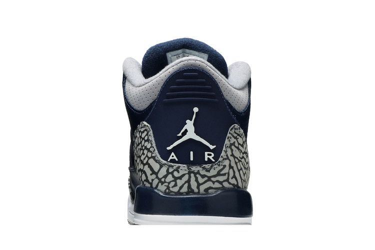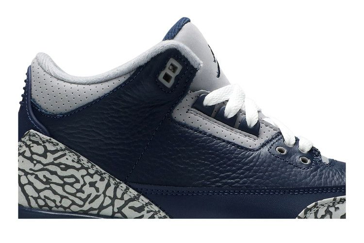 Модель Air Jordan 3 Retro GS "Georgetown", созданная для больших детей, представляет собой классический силуэт в фирменных оттенках команды Hoyas. Верхняя часть кроссовок выполнена из темно-синей кожи, дополненной брызговиками из синтетической кожи в тон и фирменными накладками с принтом слона на носке и пятке. Вышитый значок Jumpman украшает серый кожаный язычок, а второй логотип Jumpman выбит на накладке на пятке. Стандартная полиуретановая промежуточная подошва с видимой амортизацией Nike Air в пятке.