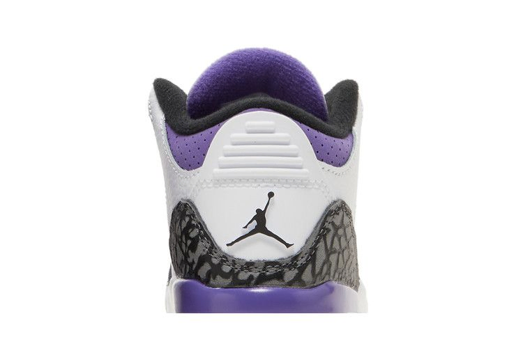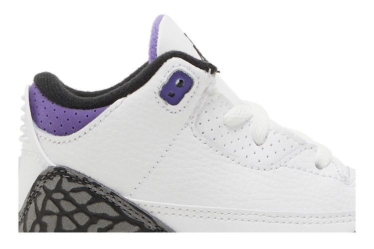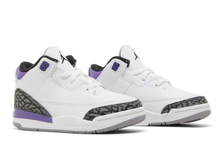 Air Jordan 3 Retro TD 'Dark Iris' - это сжатая версия культового силуэта для нового поколения поклонников Jordan. Верхняя часть кроссовок выполнена из белой галтованной кожи с фирменными накладками в виде слоновьего принта на носке и пятке. Контрастные фиолетовые акценты расположены на перфорированном замшевом воротнике и мягкой подошве из пеноматериала, обеспечивая комфортную посадку для маленьких ножек. Брендинг Jumpman украшает язычок и формованный выступ на пятке.
