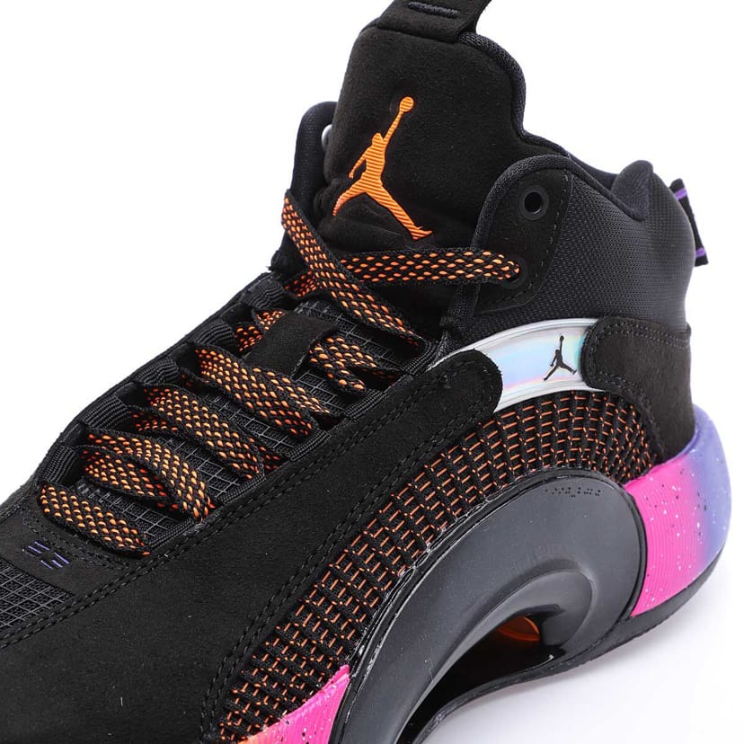 Air Jordan 35 GS Sunset представляет собой дебютную расцветку силуэта, напоминающую модель Air Jordan 5 по случаю ее 30-летия. Кроссовки украшены рядом традиционных деталей, включая накладку из замши, логотип «23» на пятке и язычок, смоделированный по образцу AJ5. Система Flightwire размещена на клетке Kurim для надежной фиксации. Мидсоль обновлена ​​за счет увеличенной пластины Eclipse Plate 2.0 с видимой амортизацией Zoom Air в области пятки и передней части стопы.