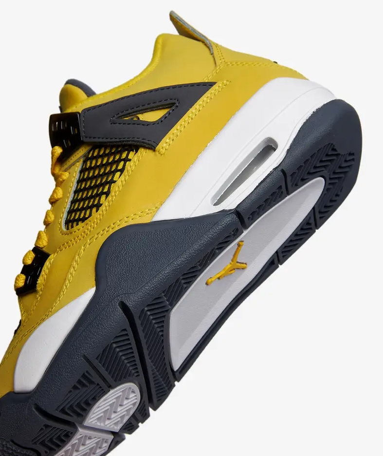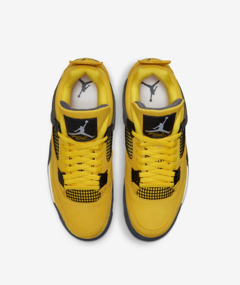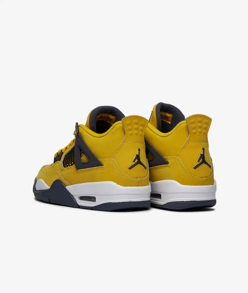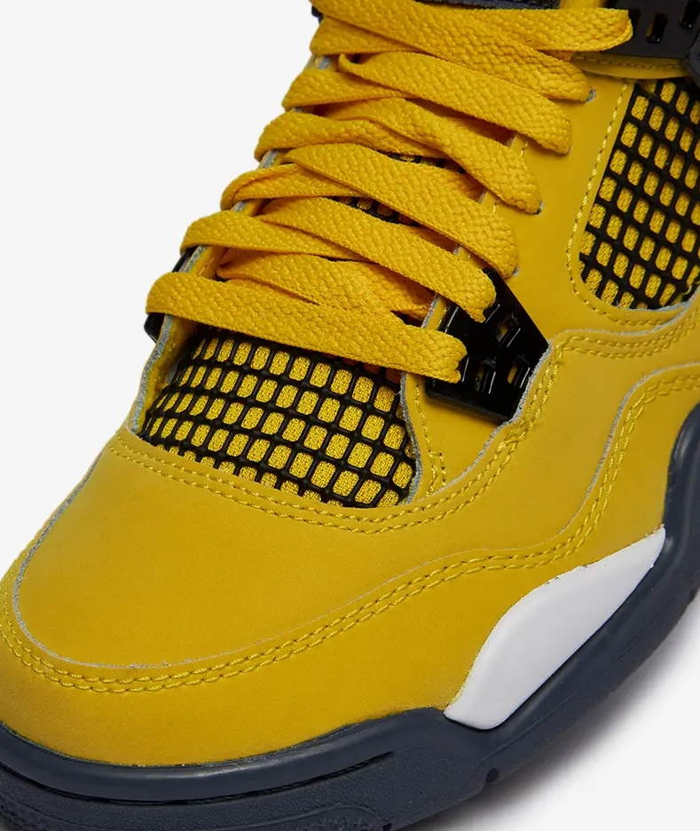Издание Air Jordan 4 Retro GS «Lightning» 2021 года возвращает востребованный цвет 2006 года в размерах для начальной школы. Как и оригинал, средний верх использует ярко-желтый нубук с черными формованными люверсами и соответствующей черной сеткой на четверти панели. Темно-серые акценты оседают на крыльях, внутреннем убранстве язычка и формованном логотипе Jumpman на пятке. Второй значок Jumpman украшает тканую бирку языка. Кроссовки установлены на белой пенной мидсоли с видимой амортизацией Air-sole в пятке. Серая резиновая подошва имеет захватывающий рисунок под ногами.- Цвета: Tour Yellow/Multi-Color/Multi-Color/Dark Blue Grey