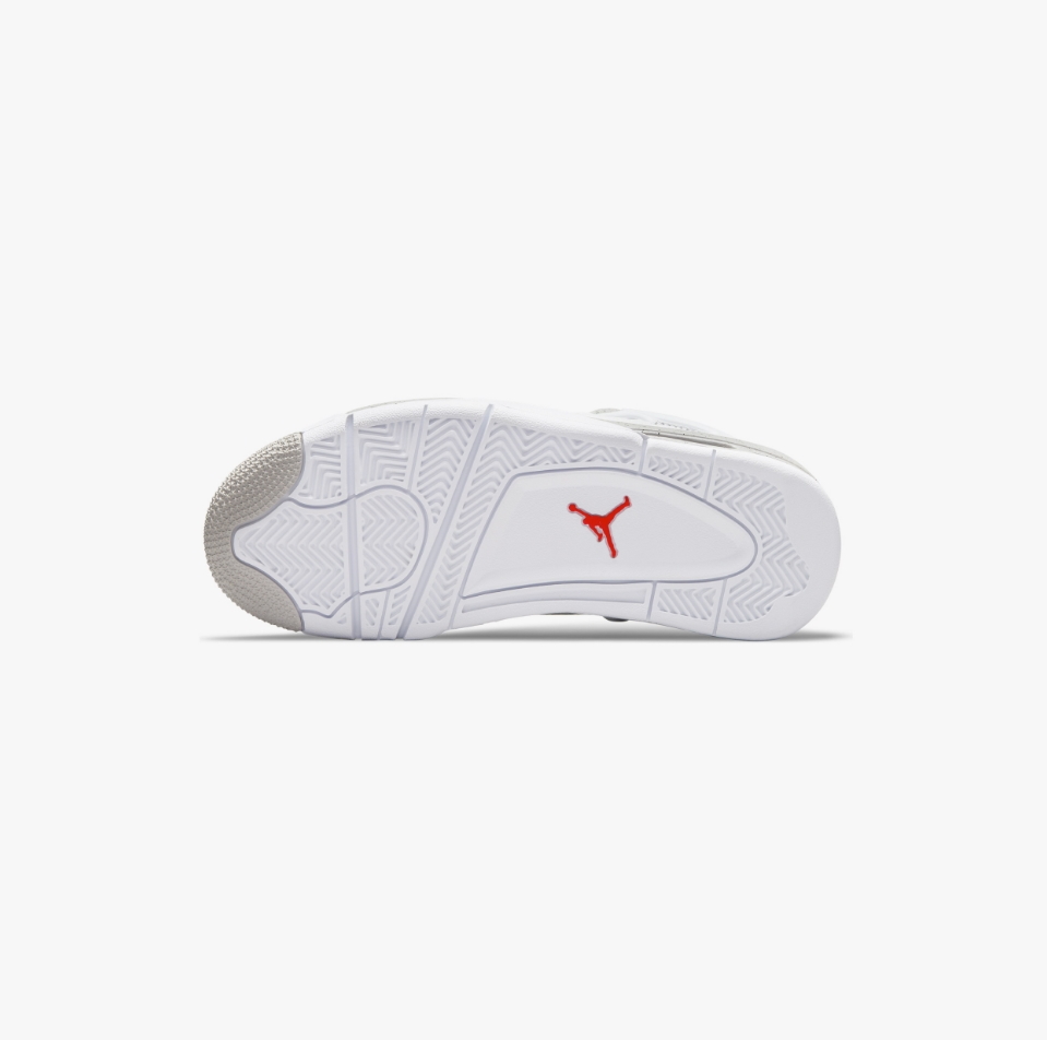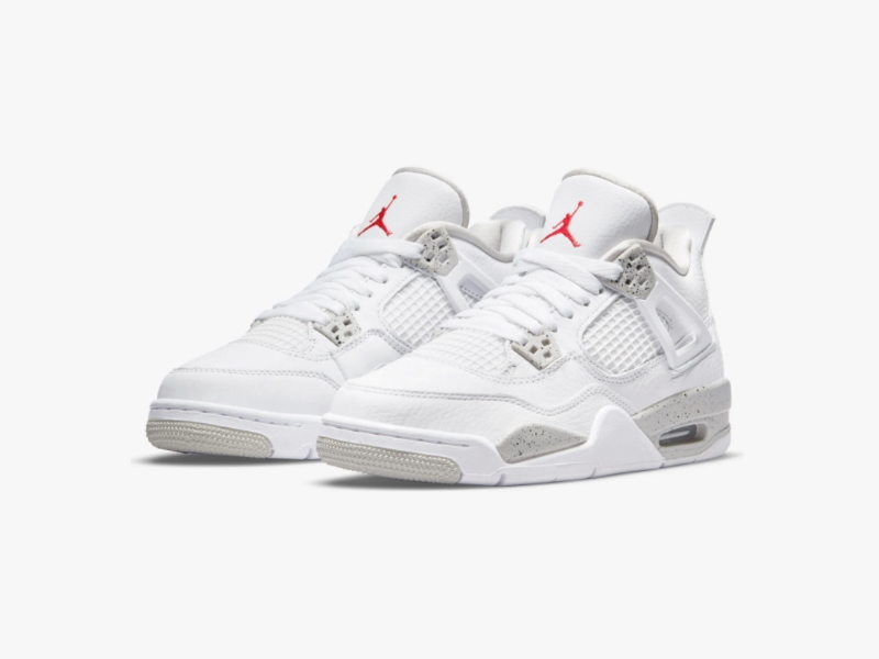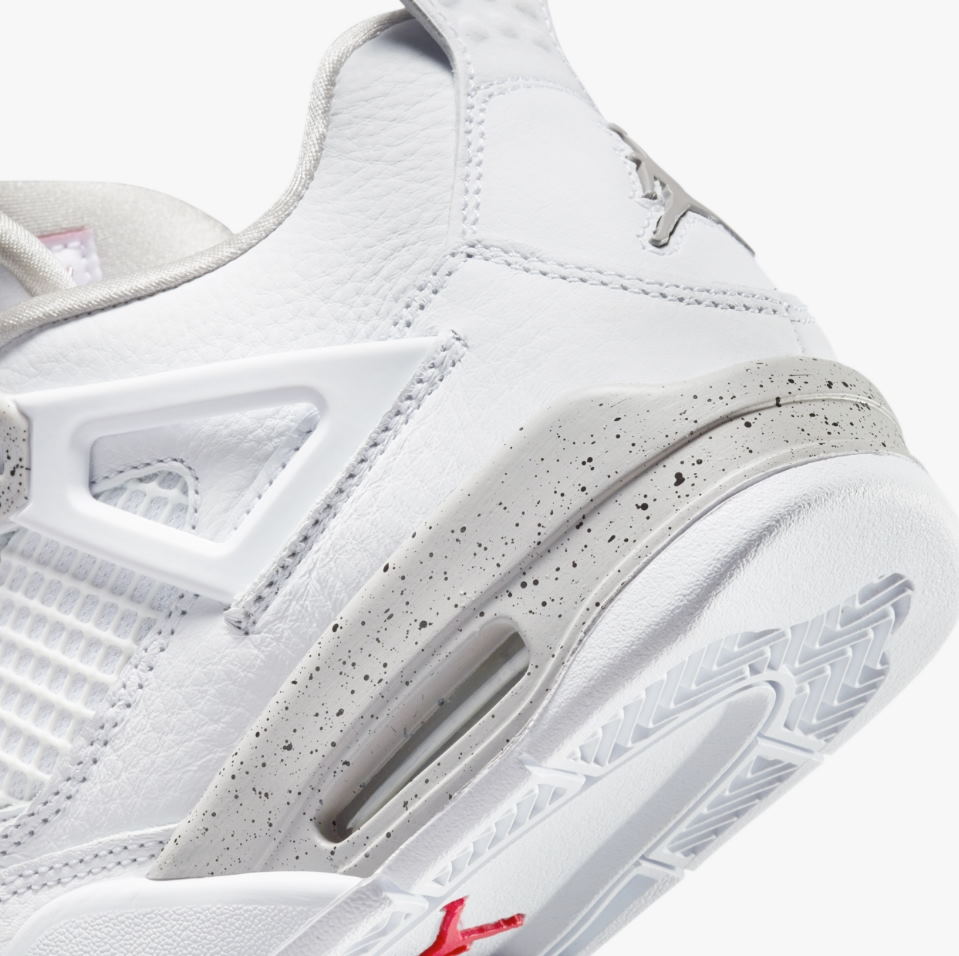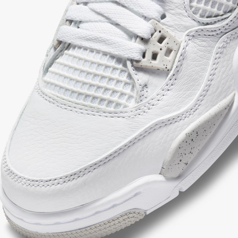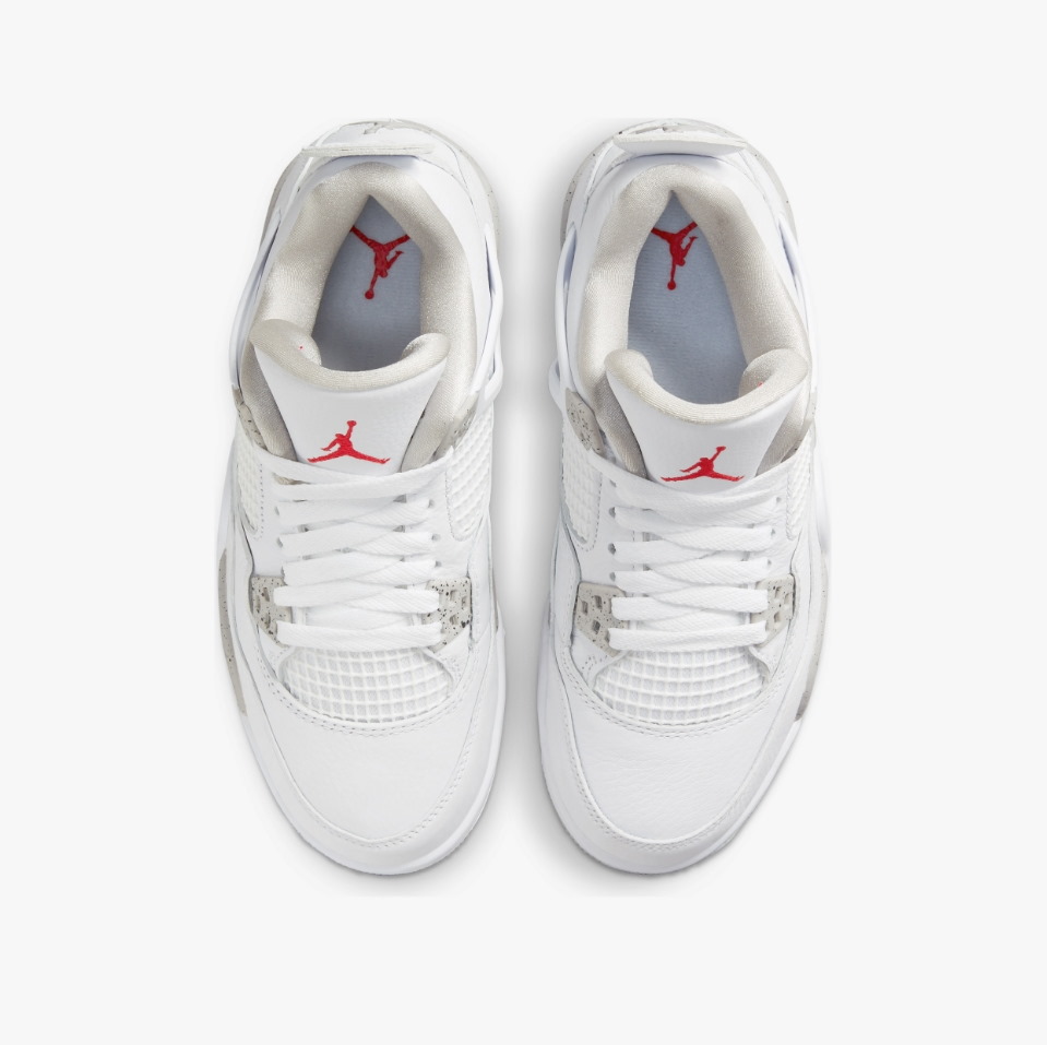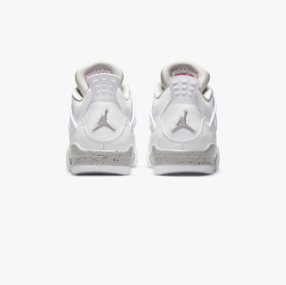 Релиз Air Jordan 4 Retro GS 'White Oreo', созданный для детей, представляет собой изысканную цветовую гамму силуэта, который носил MJ, когда он нанес удар в первом раунде плей-офф NBA 1989 года. Верх выполнен из белой мягкой кожи с серым логотипом Jumpman на пятке. Такая же серая отделка нанесена на формованные проушины и мидсоль из пеноматериала, при этом оба компонента покрыты черными крапинками. На белом кожаном язычке вышитый значок Jumpman огненно-красного цвета создает контраст.