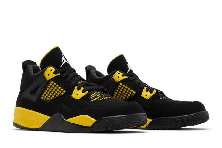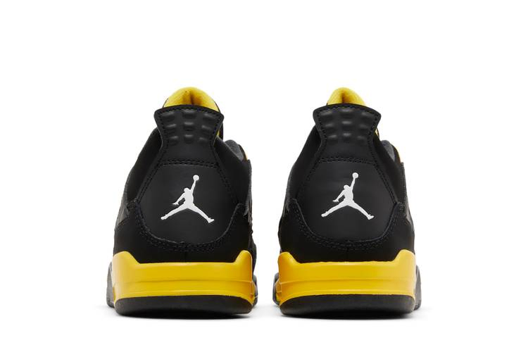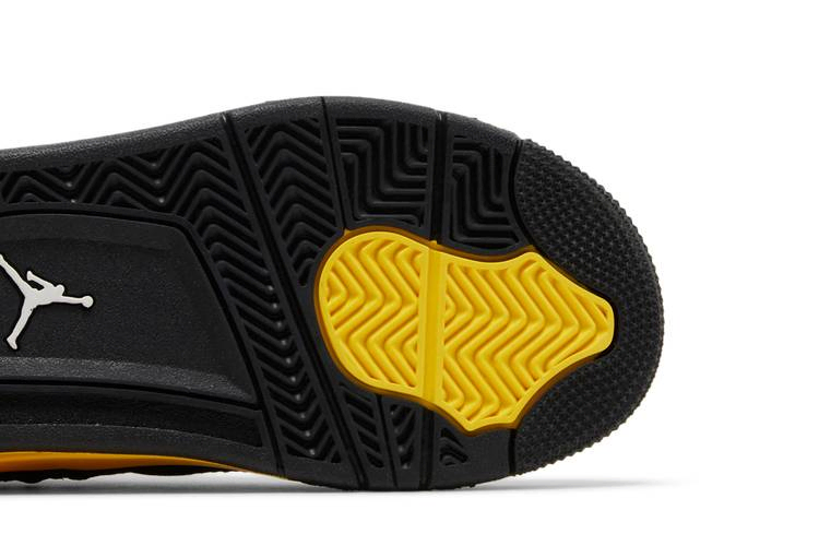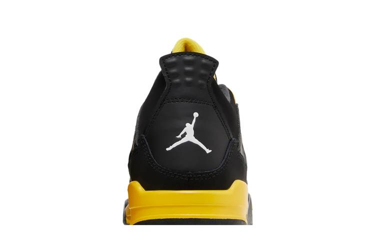 Переиздание 2023 Air Jordan 4 Retro GS "Thunder", созданное для маленьких детей, возвращает двухцветную расцветку, которая изначально появилась в 2006 году, а затем была выпущена в 2012 году. Гладкий черный нубук использован в верхней части кроссовок, а контрастные желтые цвета нанесены на литые люверсы, четверть панели и нижнюю часть язычка. Рельефный логотип Jumpman белого цвета украшает пяточный язычок, а второй Jumpman расположен на тканом язычке. Мид-топ установлен на желтую промежуточную подошву из вспененного материала, подкрепленную черной резиновой подошвой.