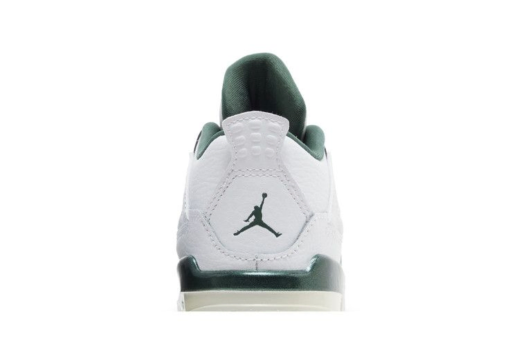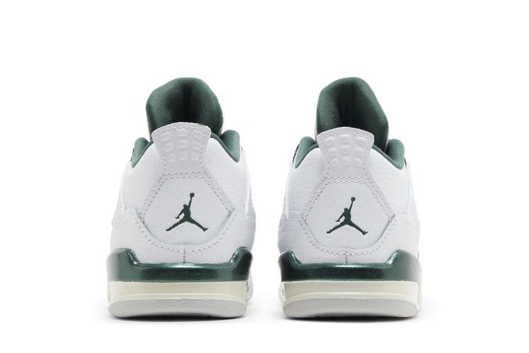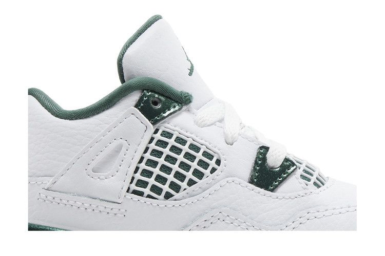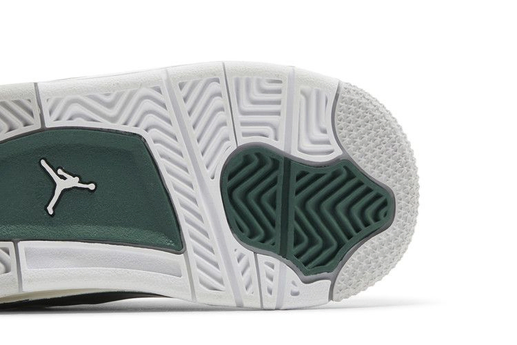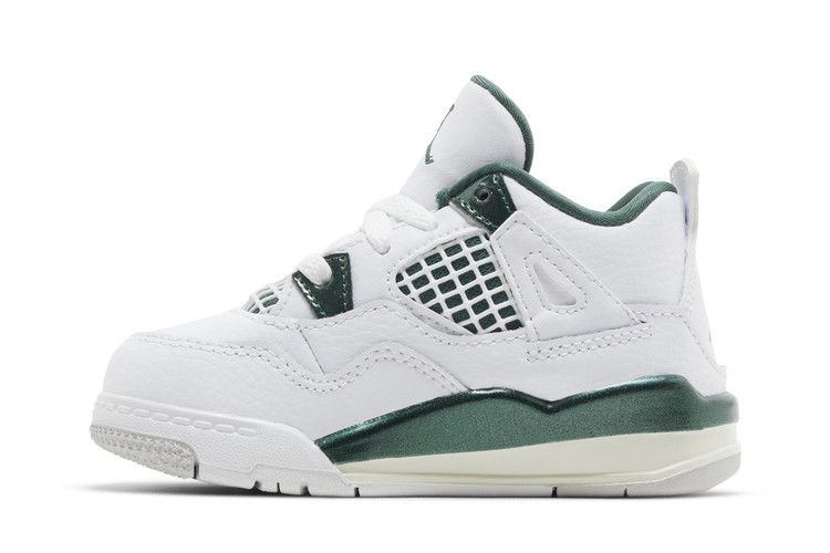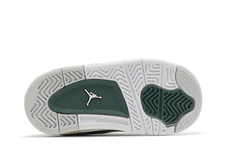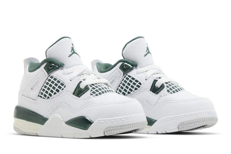 Модель Air Jordan 4 Retro TD "Oxidized Green" украшена контрастными зелеными акцентами на подкладке воротника, четвертной панели и пришитых люверсах. Темно-изумрудный оттенок повторяется на брендинге Jumpman, украшающем язычок и выступ на пятке, а также на легкой подошве из пеноматериала. Подошва из серой резины обеспечивает надежное сцепление для маленьких ножек.