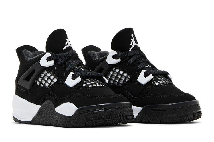 Air Jordan 4 Retro TD 'White Thunder' повторяет характерную расцветку оригинальной модели 'Thunder', имея верх из черного нубука с контрастными белыми акцентами. Они расположены на верхних и нижних люверсах, а также на сетчатой конструкции, которая появляется на четверти и горловине, обе из которых покрыты черной сеткой. Брендинг Jumpman украшает язычок и выступ на пятке. Белая межподошва из пеноматериала обеспечивает легкую амортизацию при каждом шаге.