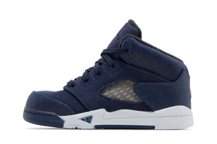 Модель Air Jordan 5 Retro SE TD "Midnight Navy" обновляет классический силуэт с верхом из замши и текстиля. Уменьшенная модель имеет дышащую сетку на задней панели, а также вышитую полосу Jumpman на язычке и пятке. Контрастная белая межподошва из пеноматериала, украшенная крапинами в виде акульих зубов, обеспечивает легкую амортизацию при каждом шаге. Резиновая подошва с рисунком "елочка" обеспечивает надежное сцепление с поверхностью для маленьких ножек.