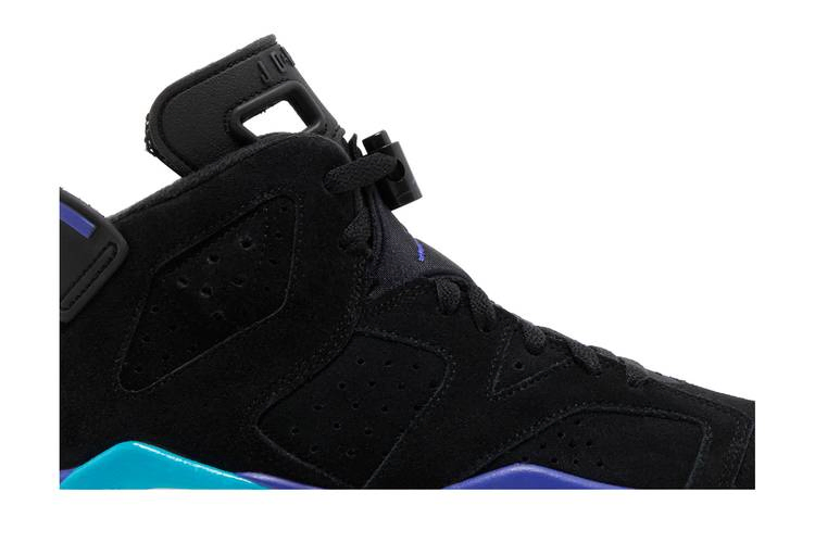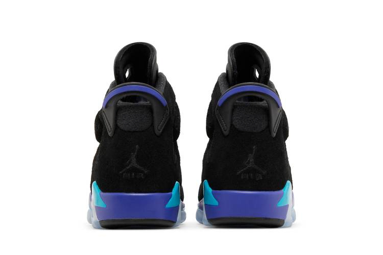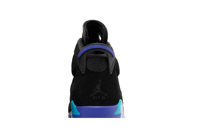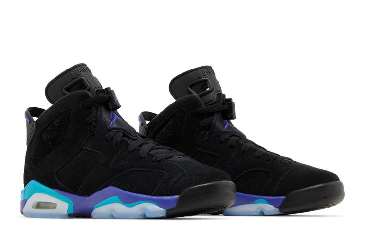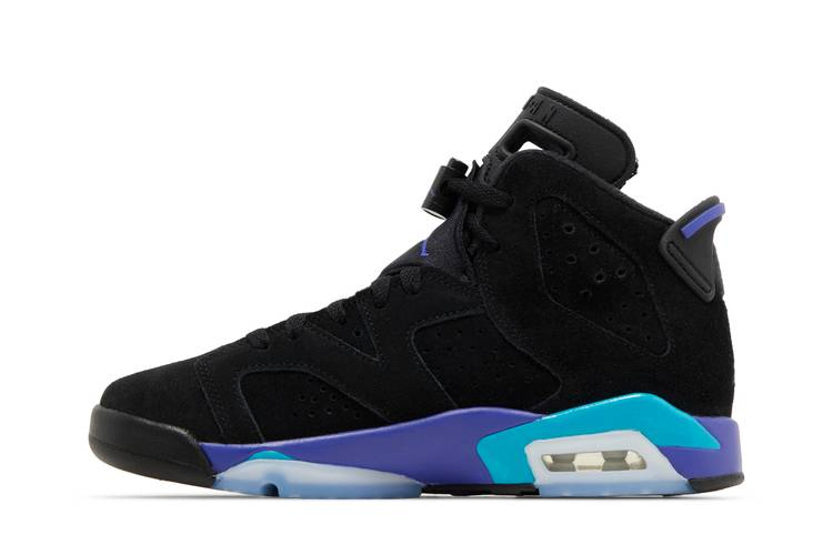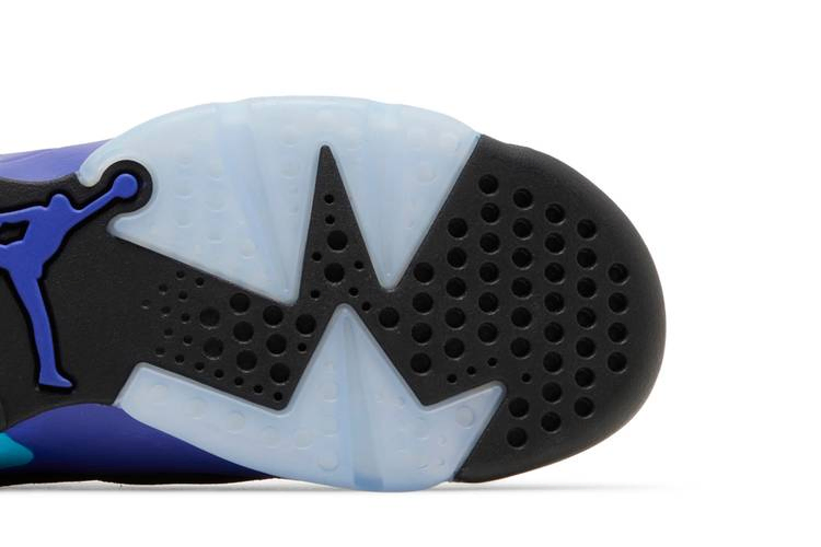 Созданные для больших детей, Air Jordan 6 Retro GS 'Aqua' вдохновлены цветовой гаммой OG модели Air Jordan 8. Чемпионский силуэт выполнен из черной замши с перфорированной подкладкой и тональным брендингом Jumpman на задней пятке. Яркие фиолетовые акценты присутствуют на формованном заднике и логотипе Jumpman, вышитом на шнурке. Тот же фиолетовый оттенок покрывает межподошву из пеноматериала, контрастируя с аква-синими деталями и дополняясь видимым блоком Air-sole в пятке. Подошва из полупрозрачной резины обеспечивает надежное сцепление с поверхностью.