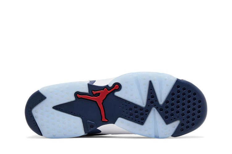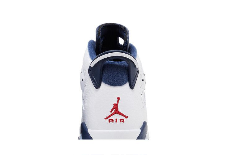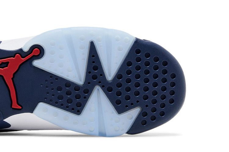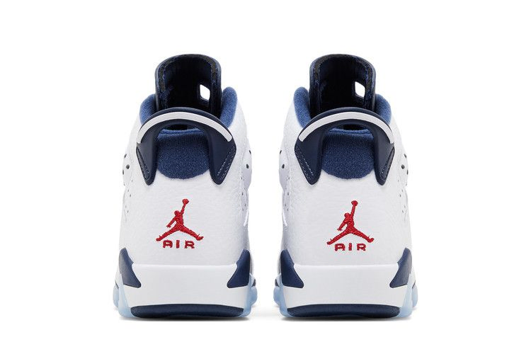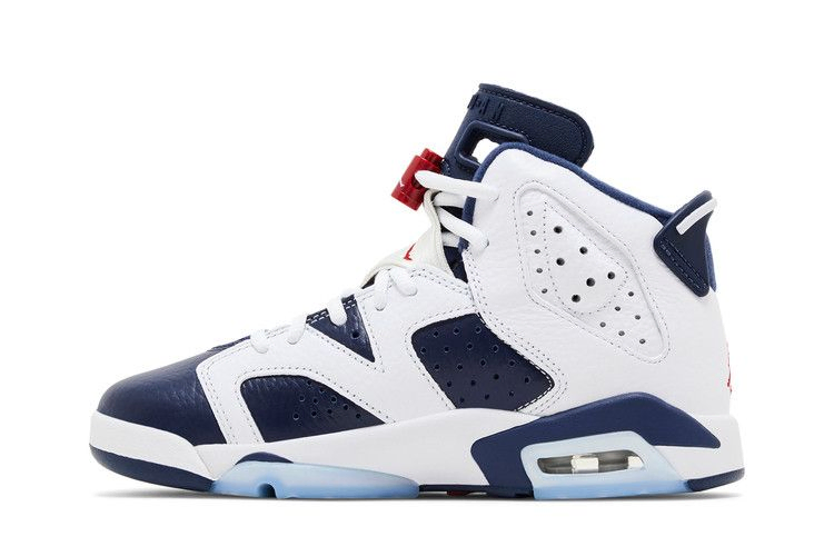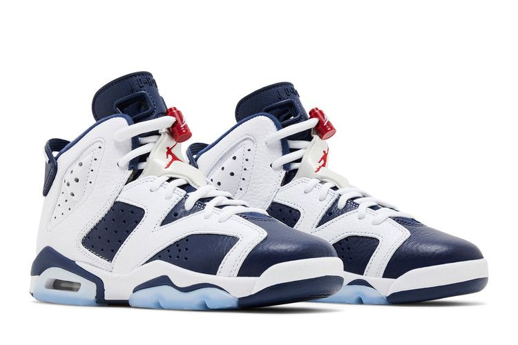 Переиздание Air Jordan 6 Retro GS 'Olympic' 2024 года возрождает тематическую расцветку США в школьном размере. Первоначально выпущенная во время Олимпийских игр в Сиднее в 2000 году, чемпионская модель получила расцветку в стиле "Carmine" и верх из галстучной кожи цвета Midnight Navy и белого. Брендинг Jumpman украшает шнуровку и заднюю часть пятки в виде вышивки Varsity Red. Кроссовки опираются на двухцветную полиуретановую промежуточную подошву с видимой амортизацией Air-sole в пятке. Полупрозрачная резиновая подошва обеспечивает надежное сцепление с поверхностью.