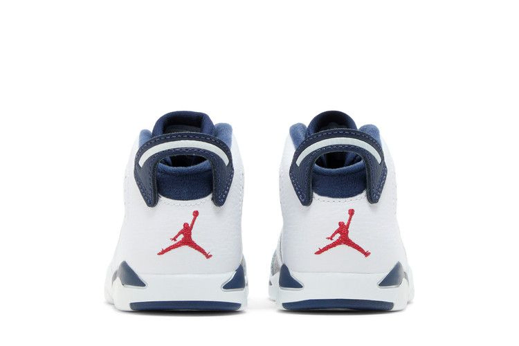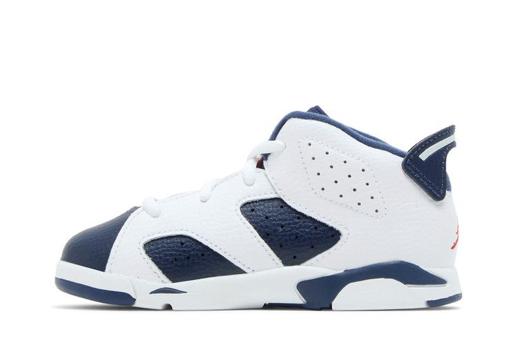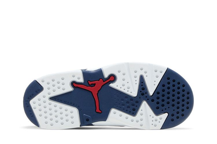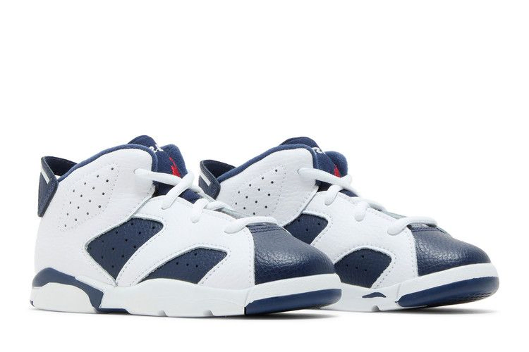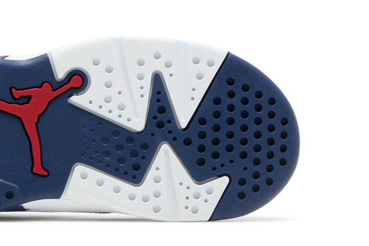 Выпуск 2024 года Air Jordan 6 Retro TD 'Olympic' возвращает патриотическую расцветку чемпионской модели, первоначально выпущенной в 2000 году во время Олимпийских игр в Сиднее. Верхняя часть кроссовок, выполненная из галтованной кожи, имеет основной цвет Midnight Navy с контрастными белыми накладками. Вышитые логотипы Jumpman красного цвета украшают язычок и заднюю часть пятки. Легкая двухцветная подошва из пеноматериала поддерживает уменьшенную конструкцию.
