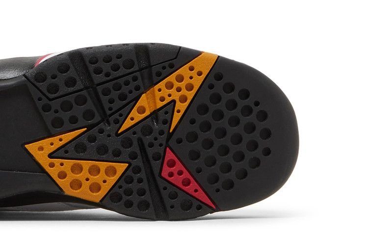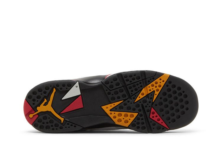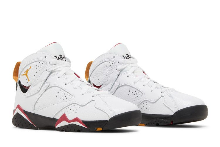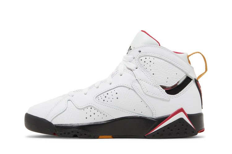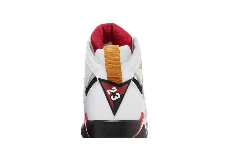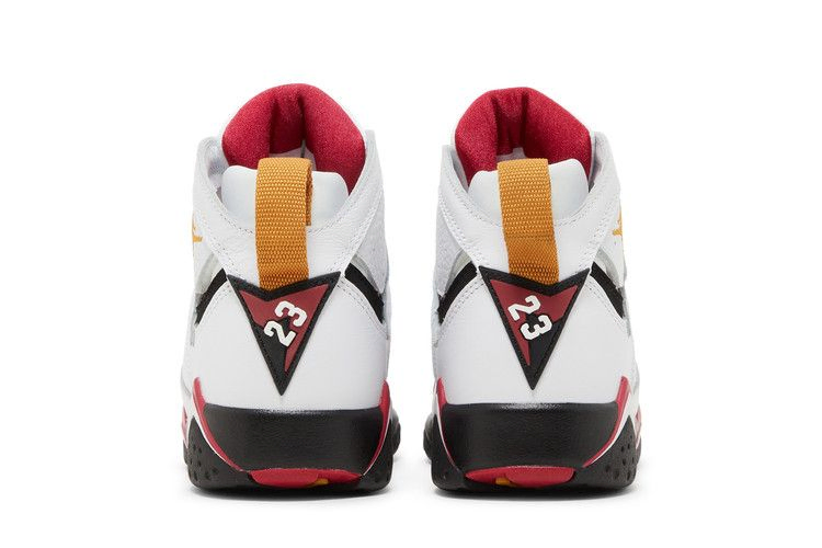 Модель 2022 года Air Jordan 7 Retro GS 'Cardinal', представленная в большом детском размере, возвращает чемпионский силуэт в расцветке OG по случаю его 30-летнего юбилея. В отличие от предыдущих моделей Jordan, на пятке вместо брендинга Nike Air красуется нашивка "23" в красно-черных тонах. Дизайн выделяется на фоне белой кожи с перфорированной подкладкой для лучшей воздухопроницаемости. Логотип Jumpman, вышитый на боковом воротнике, и вставка из тесьмы, прикрепленная к пятке. Легкая амортизация обеспечивается черной подошвой из пеноматериала с угловатыми акцентами белого и кардинально-красного цветов.