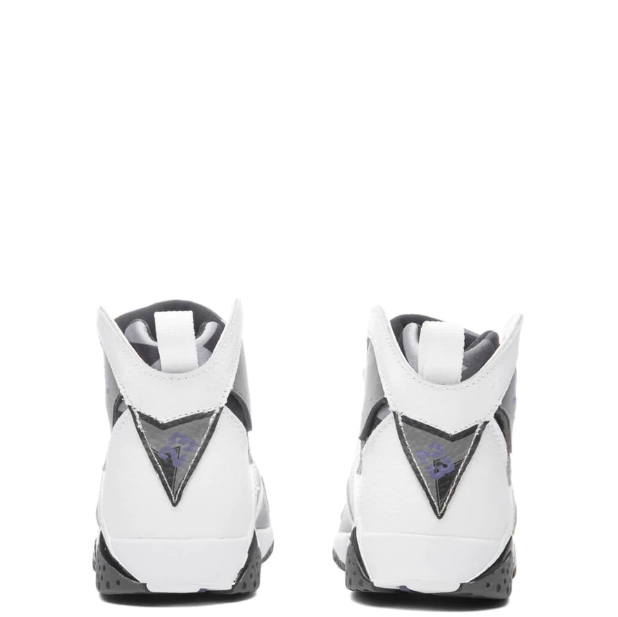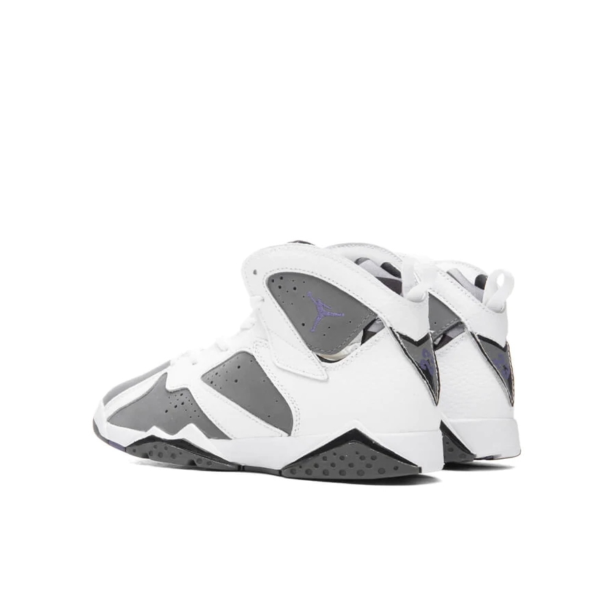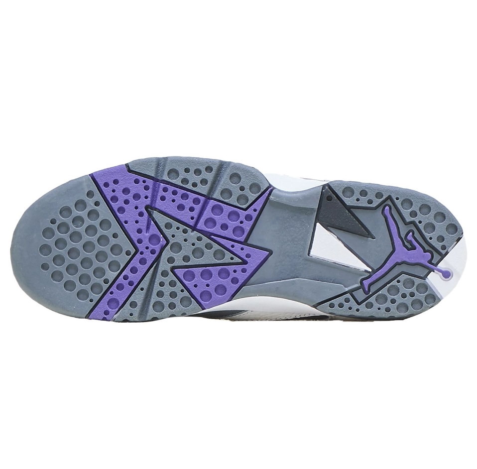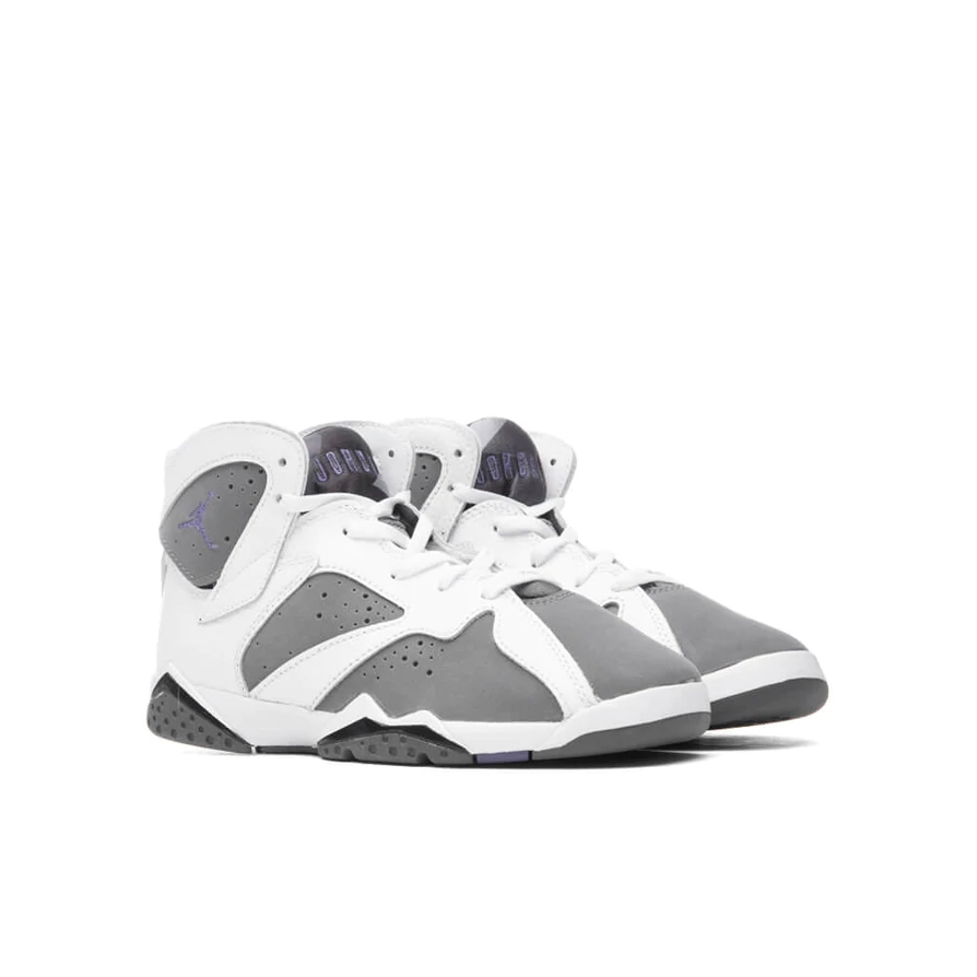 Модель Air Jordan 7 Retro PS 'Flint' 2021 года возрождает расцветку 2006 года для маленьких детей. Внешний вид соответствует оригиналу: верх выполнен из серого нубука и белой кожи. На фирменном язычке Air Jordan 7 вышивка «Air Jordan» фиолетовыми буквами, соединенная с внутренним рукавом в стиле Huarache и покрытая уникальным геометрическим принтом. Соответствующие фиолетовые акценты присутствуют на логотипе Jumpman на боковом воротнике и литой цифре 23 на пятке.- Цвета: White/Flint Grey/Varsity Purple