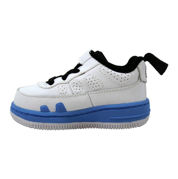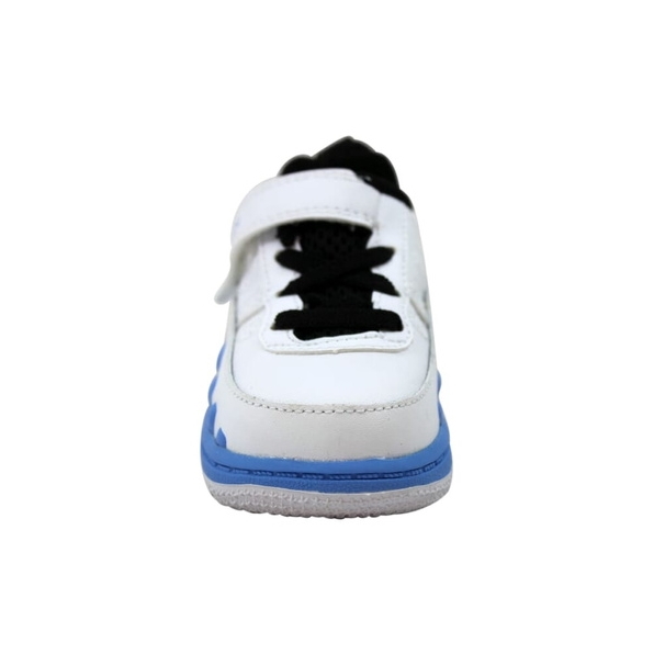 Air Jordan Fusion 9 White University Blue TD имеет белый кожаный верх, подчеркнутый синей мидсолью, черный язычок и черные шнурки. Другие акценты университетского синего цвета на этой паре можно увидеть на язычке, пятке и кружевной бирке.