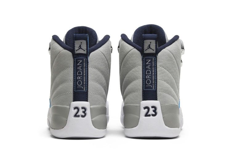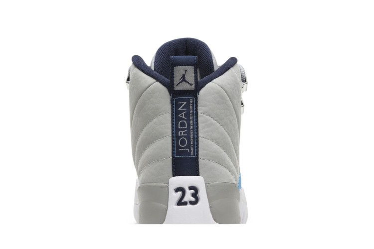 Детские Air Jordan 12 Retro выполнены в простой серо-белой расцветке, дополненной различными оттенками синего. Фирменный университетский синий цвет присутствует на брендинге Jumpman на брызговике и язычке. Он также присутствует на подошве, в то время как более темный синий цвет присутствует на пластине голенища из углеродного волокна, подошве Jumpman и внутренней подкладке. Надпись "Two 3" на язычке совпадает с надписью на брызговике и подошве.