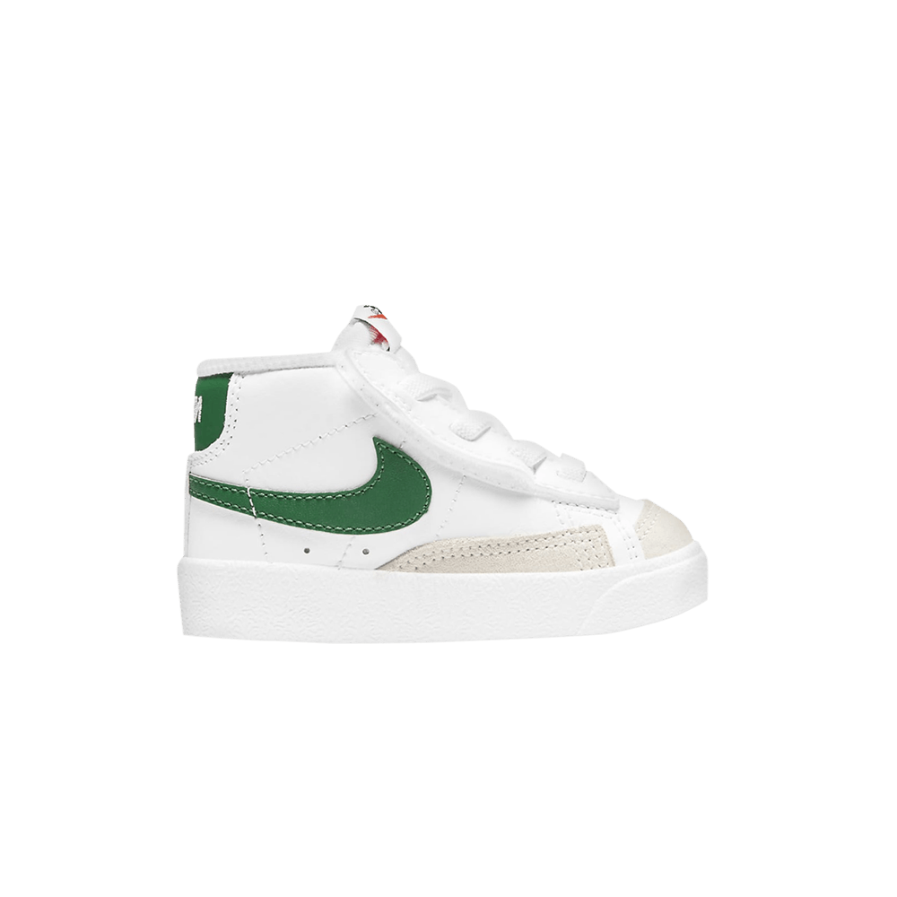 Созданные для малышей, Nike Blazer Mid '77 TD 'White Pine Green' представляют собой уменьшенную версию ретро-кроссовок, названных в честь команды Portland Trail Blazers. Белые кожаные кроссовки со скользящей конструкцией, застегивающиеся на крючок и петлю под каждым веком, позволяют открывать декоративную шнуровку. Контрастный цвет придает зеленый логотип Swoosh и соответствующий зеленый язычок на пятке. Подошва из резины "елочка" обеспечивает надежное сцепление с поверхностью.