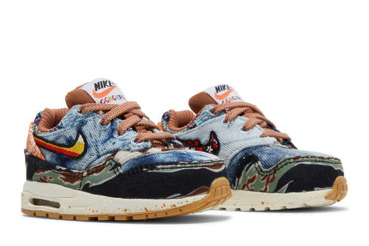 Concepts x Nike Air Max 1 SP TD 'Heavy' имеют эклектичный дизайн, вдохновленный экспрессивной фестивальной модой конца 60-х годов. Бостонский ритейлер одел уменьшенную модель в синий деним с тигровым камуфляжем и накладкой на пятку с принтом банданы. На задней панели пришиты несочетаемые Swooshes, которые дополнены разноцветными цветами и полосками. Тема концерта на открытом воздухе завершается межподошвой, забрызганной грязью, с видимой амортизацией Air-sole и резиновой подошвой цвета загара.